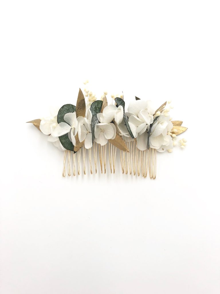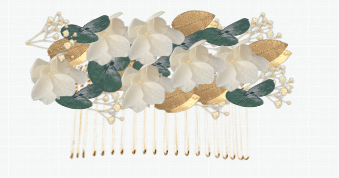 Le peigne personnalisé imaginé et créé en ligne par Anaïs, future mariée de 2019, est une variante très élégante du mélange de couleurs doré, végétal et blanc. Cette association à la fois classique et harmonieuse permet d’apporter un côté végétal à nos collections dorées, telles que la gamme Ori.