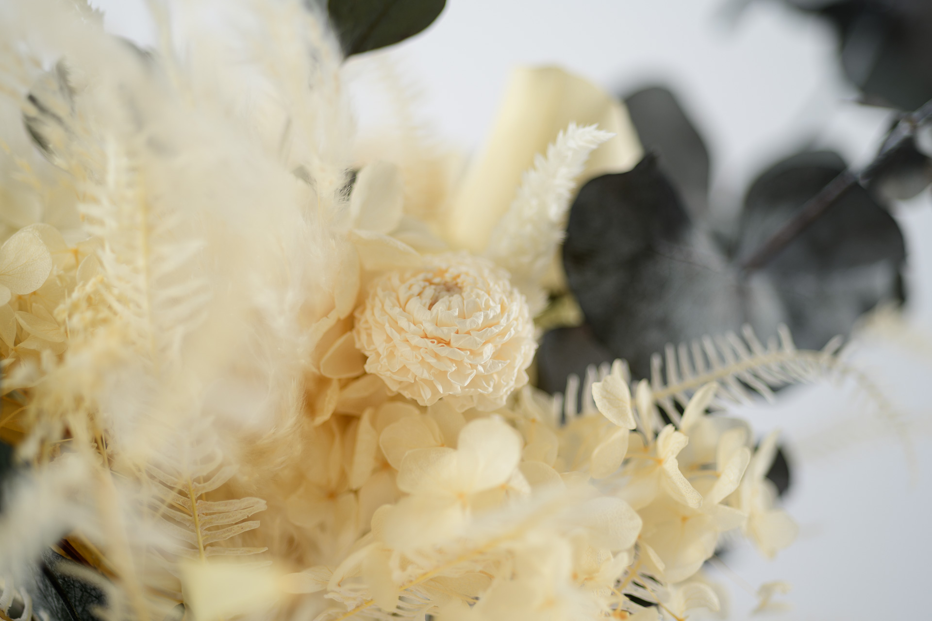 Fleurs stabilisées et fleurs séchées ont toutes deux des vertus différentes mais complémentaires, surtout lorsqu’il s’agit de créer des accessoires de mariage intemporels mais naturels.