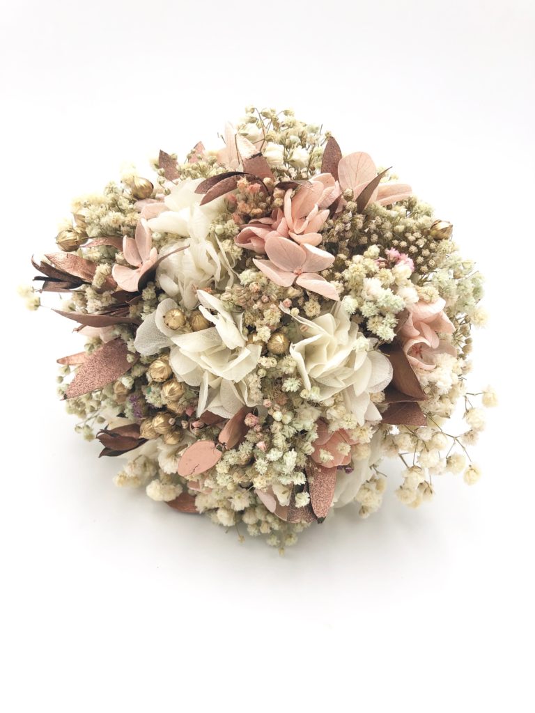 Nous avons décliné ces couleurs sur la collection Candi, qui mêle hortensias stabilisées blanches et rose pêche, ainsi que la gamme Candi dorée, qui ajoute de petites touches de feuilles dorées pour un côté bijou très esthétique.