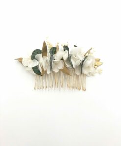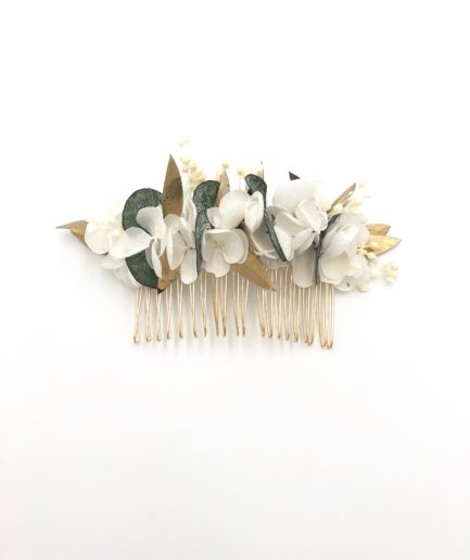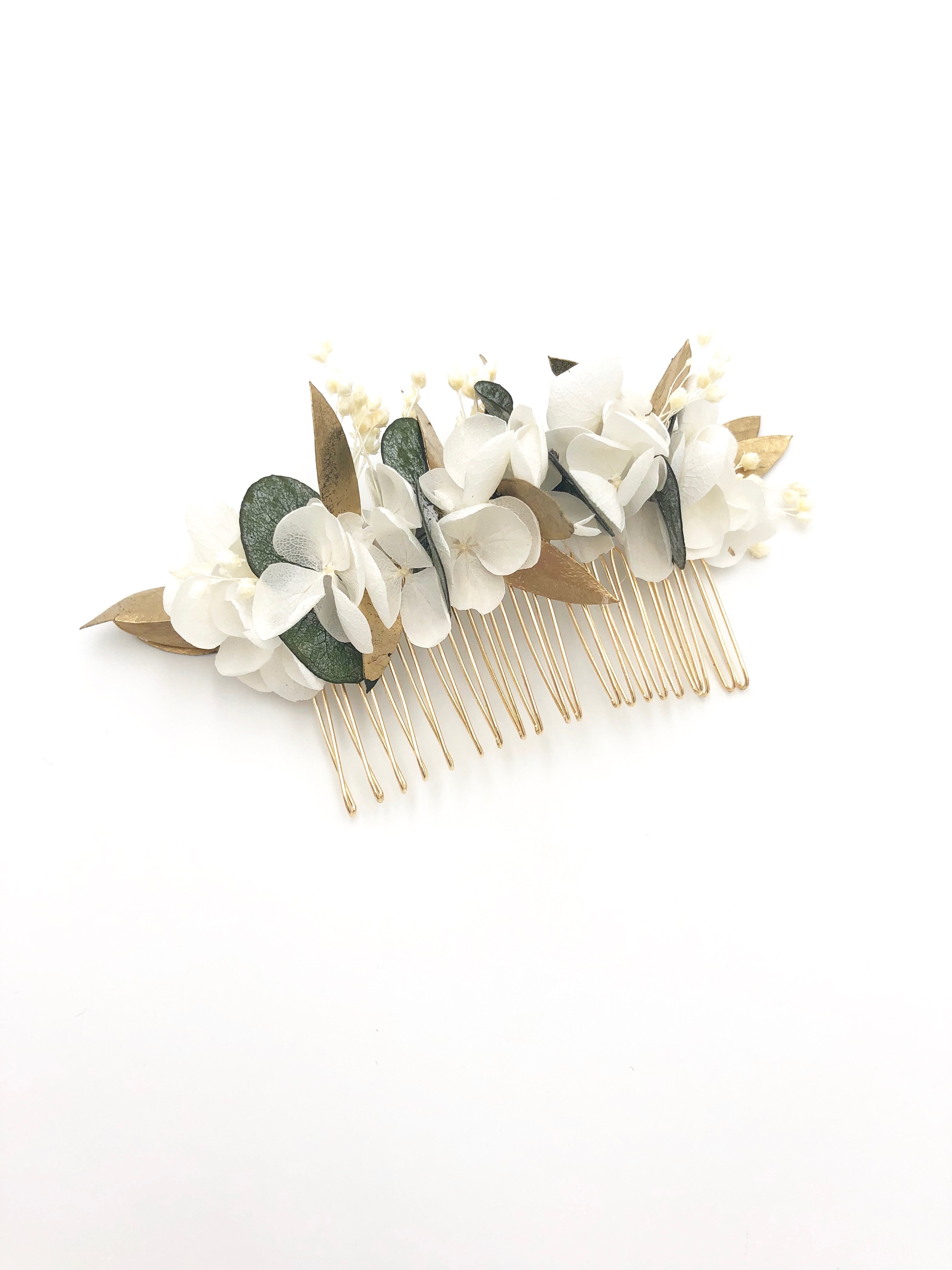 Peigne de fleurs stabilisées Opaline aux tons végétal et blanc