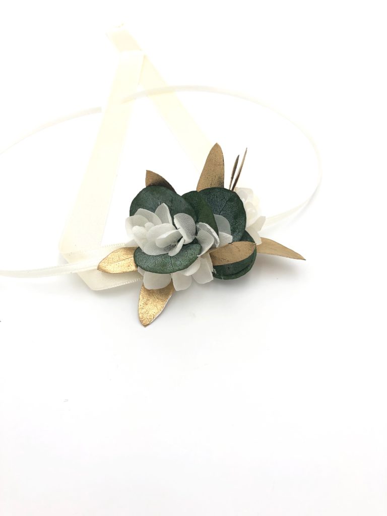Le peigne personnalisé imaginé et créé en ligne par Anaïs, future mariée de 2019, est une variante très élégante du mélange de couleurs doré, végétal et blanc. Cette association à la fois classique et harmonieuse permet d’apporter un côté végétal à nos collections dorées, telles que la gamme Ori.