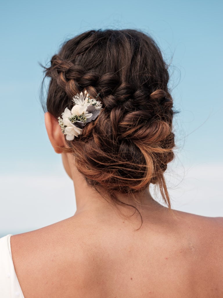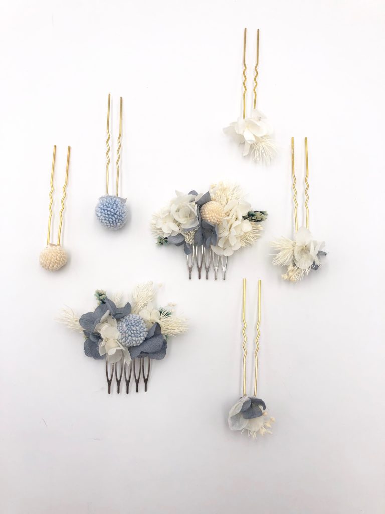 Enfin, en plus des traditionnels grands pics à chignon, nous proposons nos sets, constitués de mini peignes associés à ces pics à cheveux, mais aussi de headbands mini accompagnés de pics, qui permettent de vous imaginer la composition parfaite de bijoux de fleurs stabilisées pour votre coiffure de mariée.