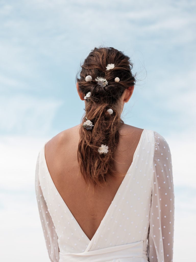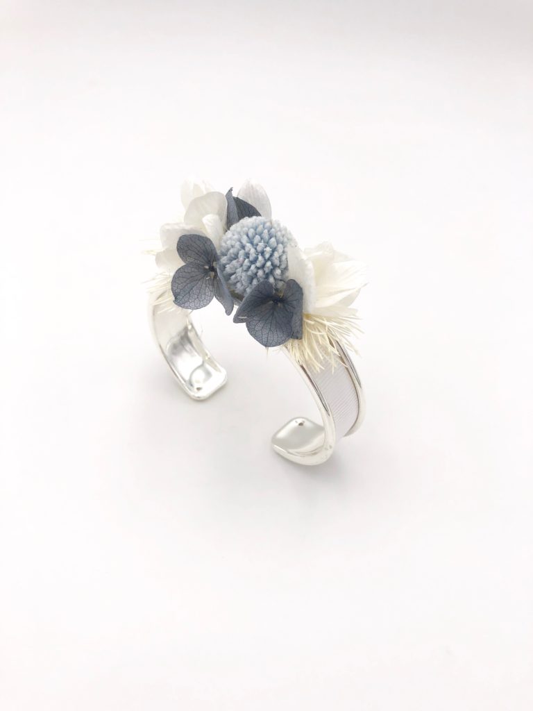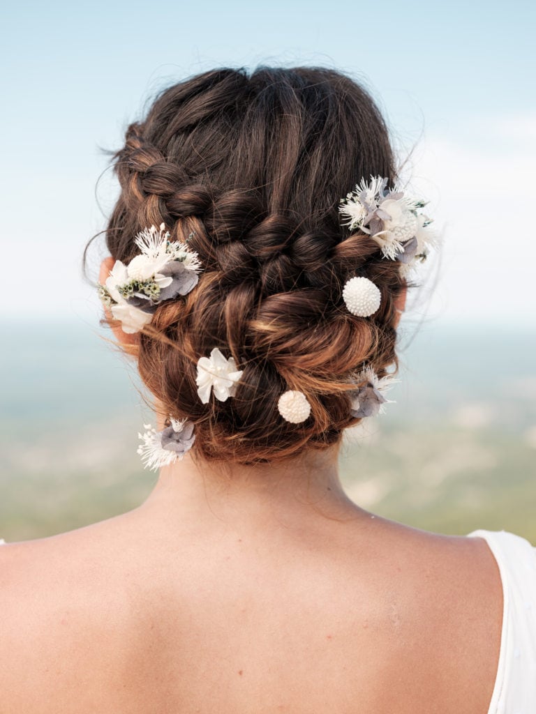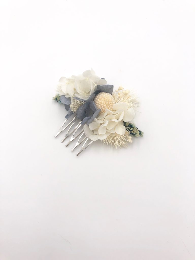Horizon mêle ainsi des hortensias mini bleu horizon, à du limonium stabilisé bleu-vert, ainsi que des hortensias mini blancs et des craspedias mini bleu pâle. Ce mélange apporte modernité et élégance à la coiffure de la mariée, clin d’œil aux dégradés de couleur qui peignent le ciel lors d’une douce soirée d’été.