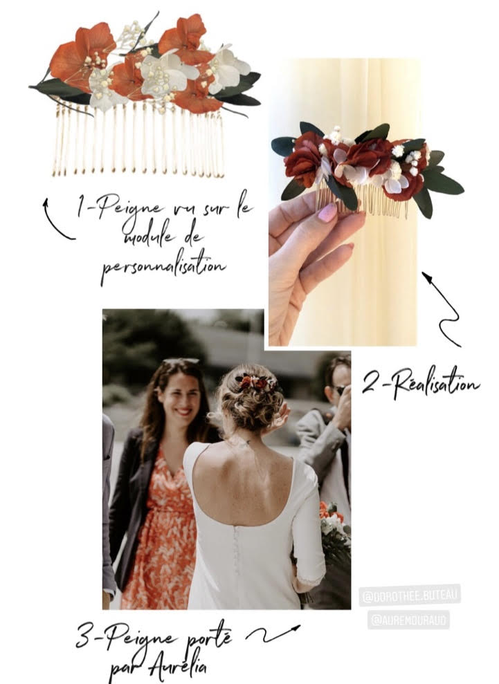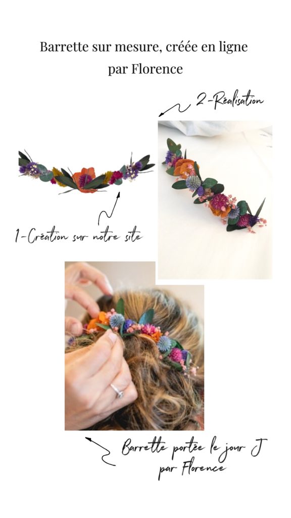 Sur notre module en ligne, vous pouvez également créer votre propre couronne de fleurs, peigne fleuri ou encore headband en choisissant les fleurs de votre choix et en les disposant à votre manière à vous !