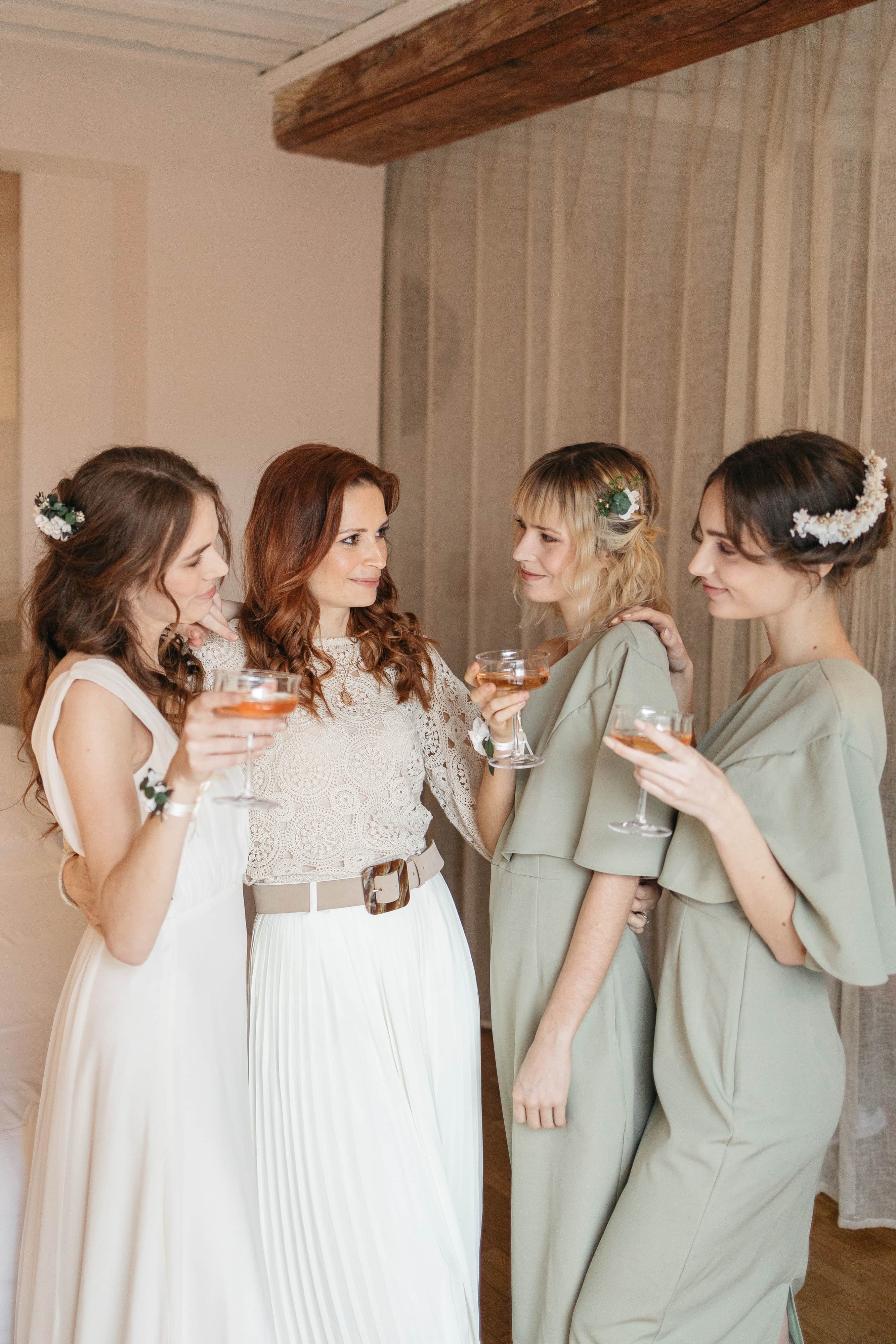 Le blush fait également écho à la douceur de tonalités pastels, à cet instant où la mariée se fait pomponner, étoile d’un jour, entourée de ses demoiselles d’honneur, dans des moments de complicité rare et de joie intense.