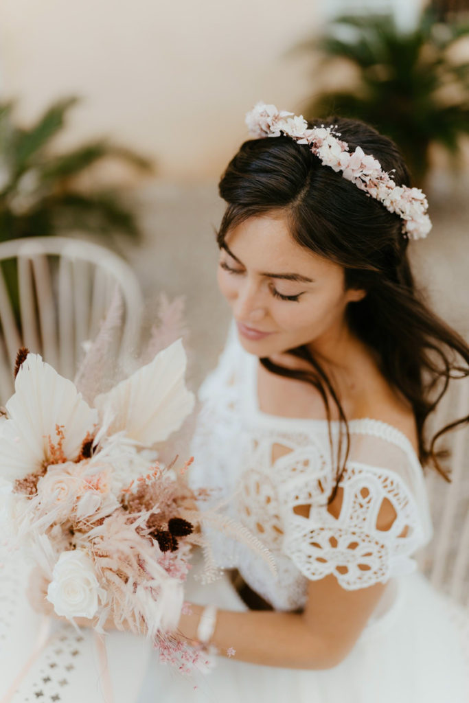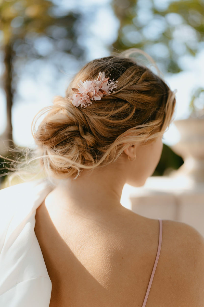 Vous y retrouverez l’ensemble de nos accessoires classiques, entre les peignes, mini peignes, peignes longs, couronnes et autres headbands. Sans oublier les accessoires pour les demoiselles d’honneur, comme nos bracelets, joncs et petites et mini barrettes. Ainsi que notre bouquet stabilisé, chic et féminin, à l’allure indiscernable de fleurs fraiches !
