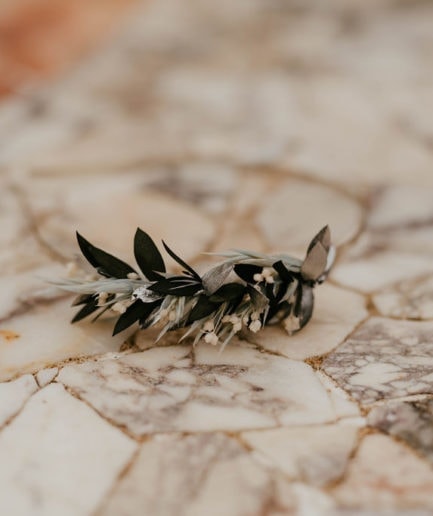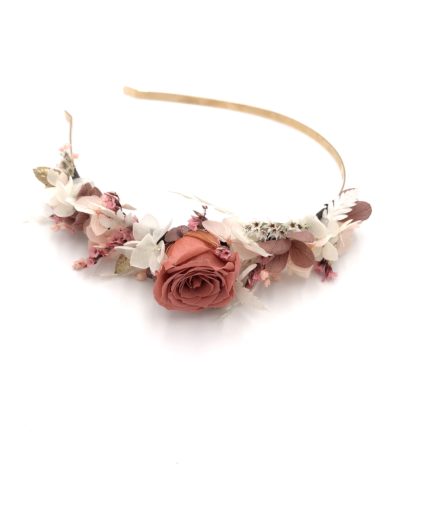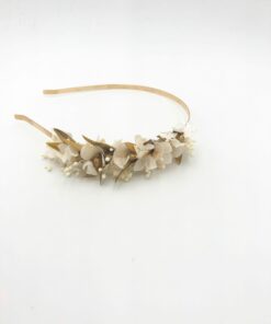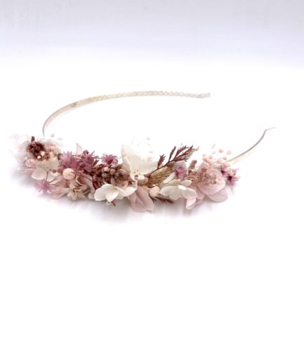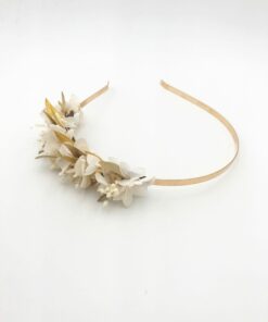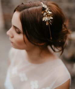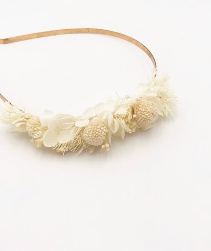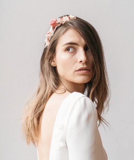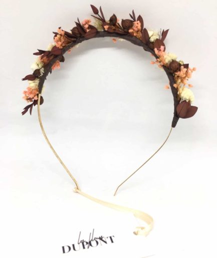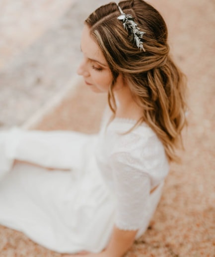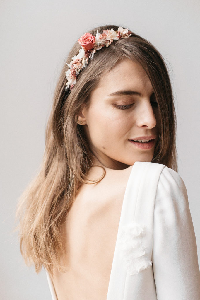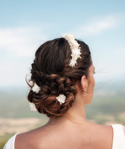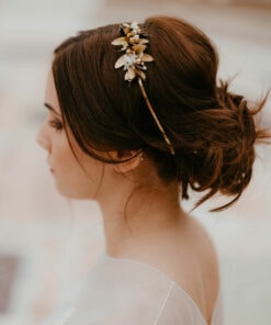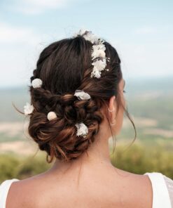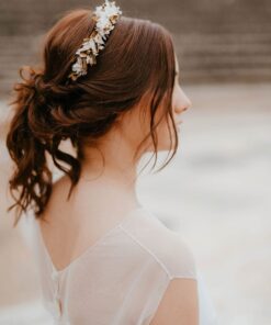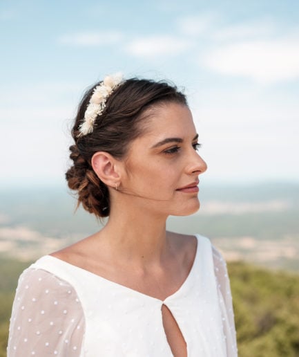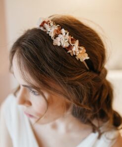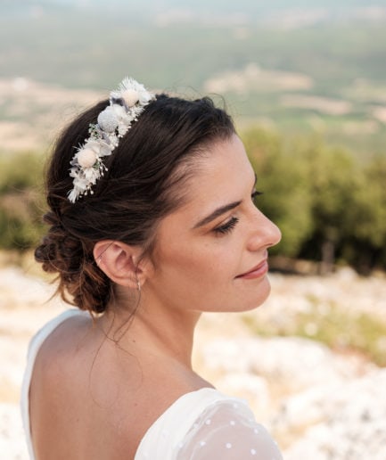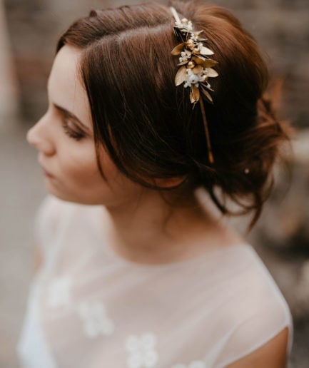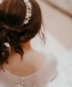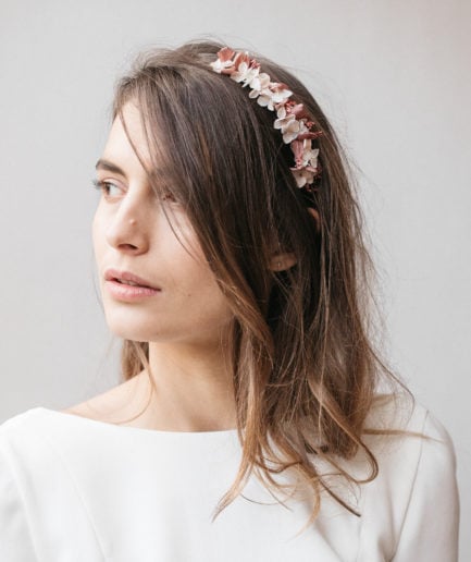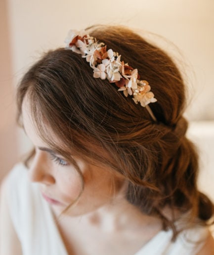 Les headbands sont réalisés à la main, sur des bases en métal doré ou argenté, apportant cette touche de bijou chic et délicat à la mariée. Nos headbands de mariage en fleurs se placent très facilement et de différentes façons.