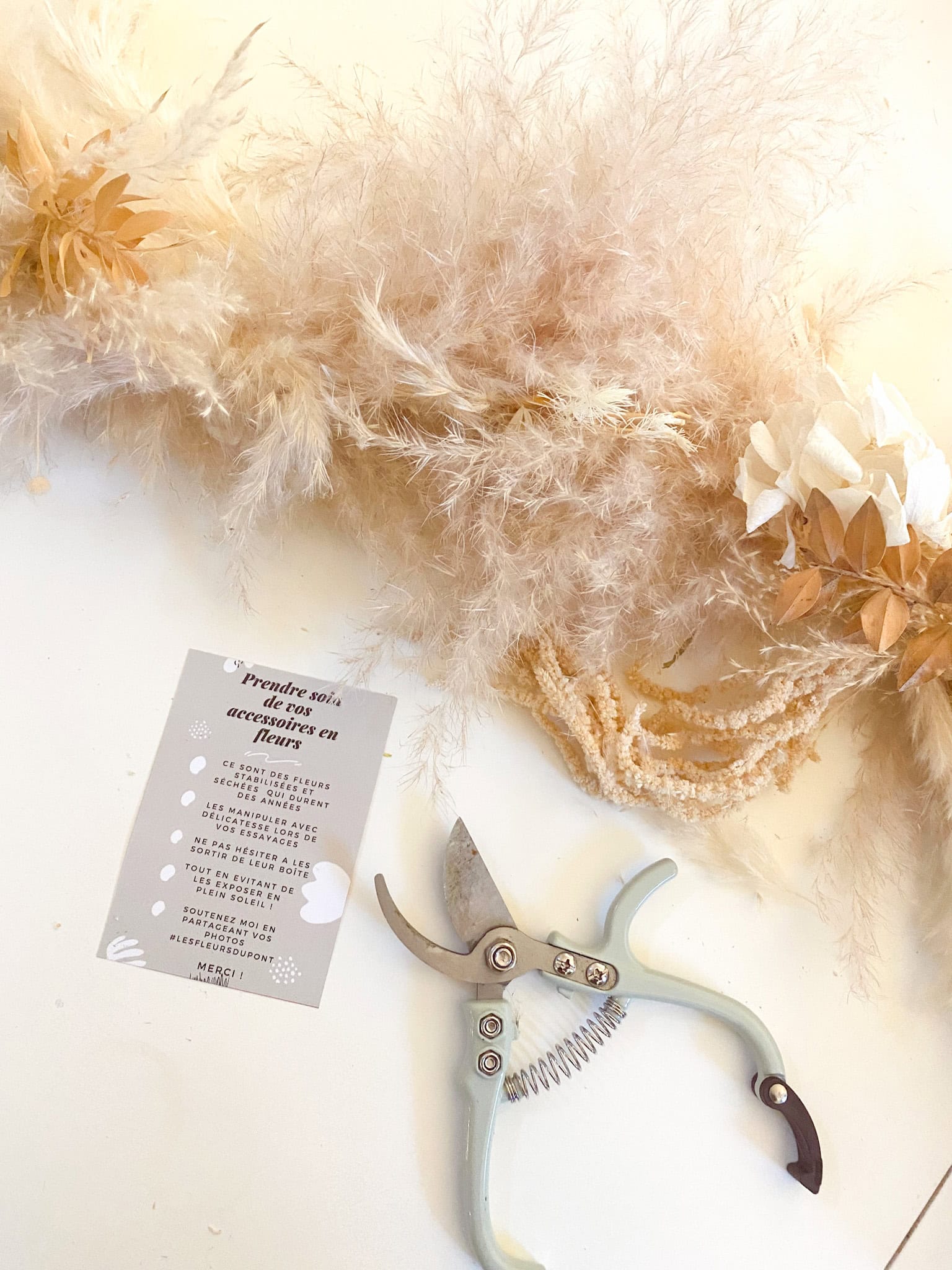 - Matériel fourni : Une sélection de fleurs séchées et stabilisées, outils et rubans