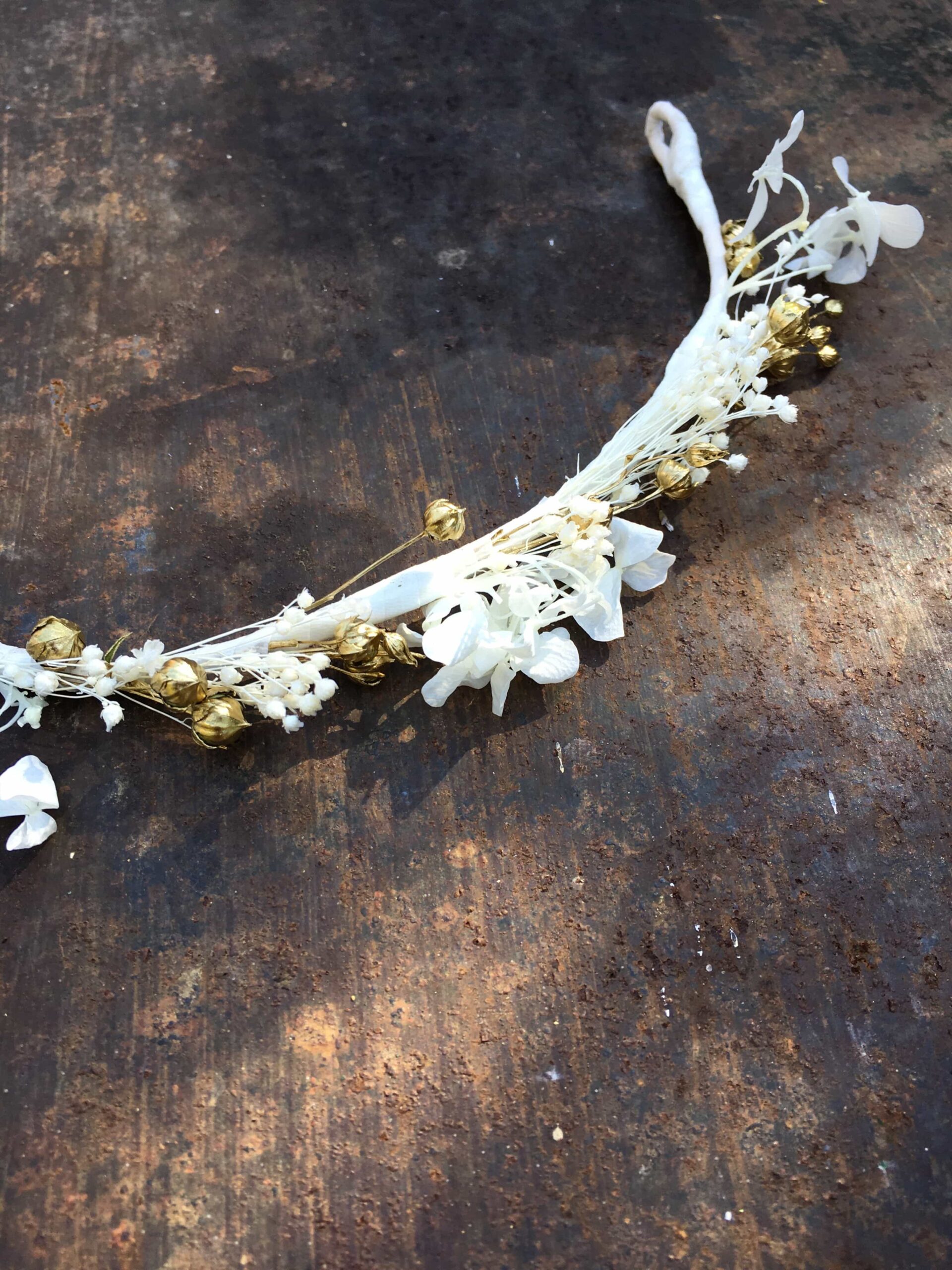 - Fleurs stabilisées haute-qualité (hortensias blancs, broom blanc)