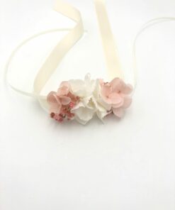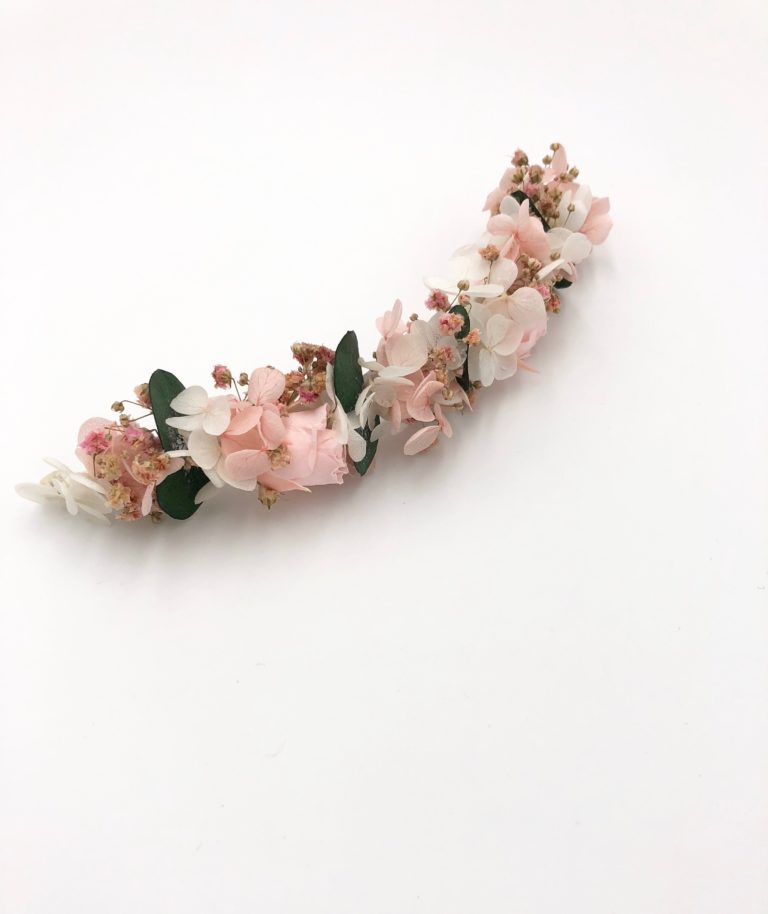- Fleurs stabilisées haute-qualité (rose, eucalyptus, hortensia mini blanche et rose et gypsophile rose)