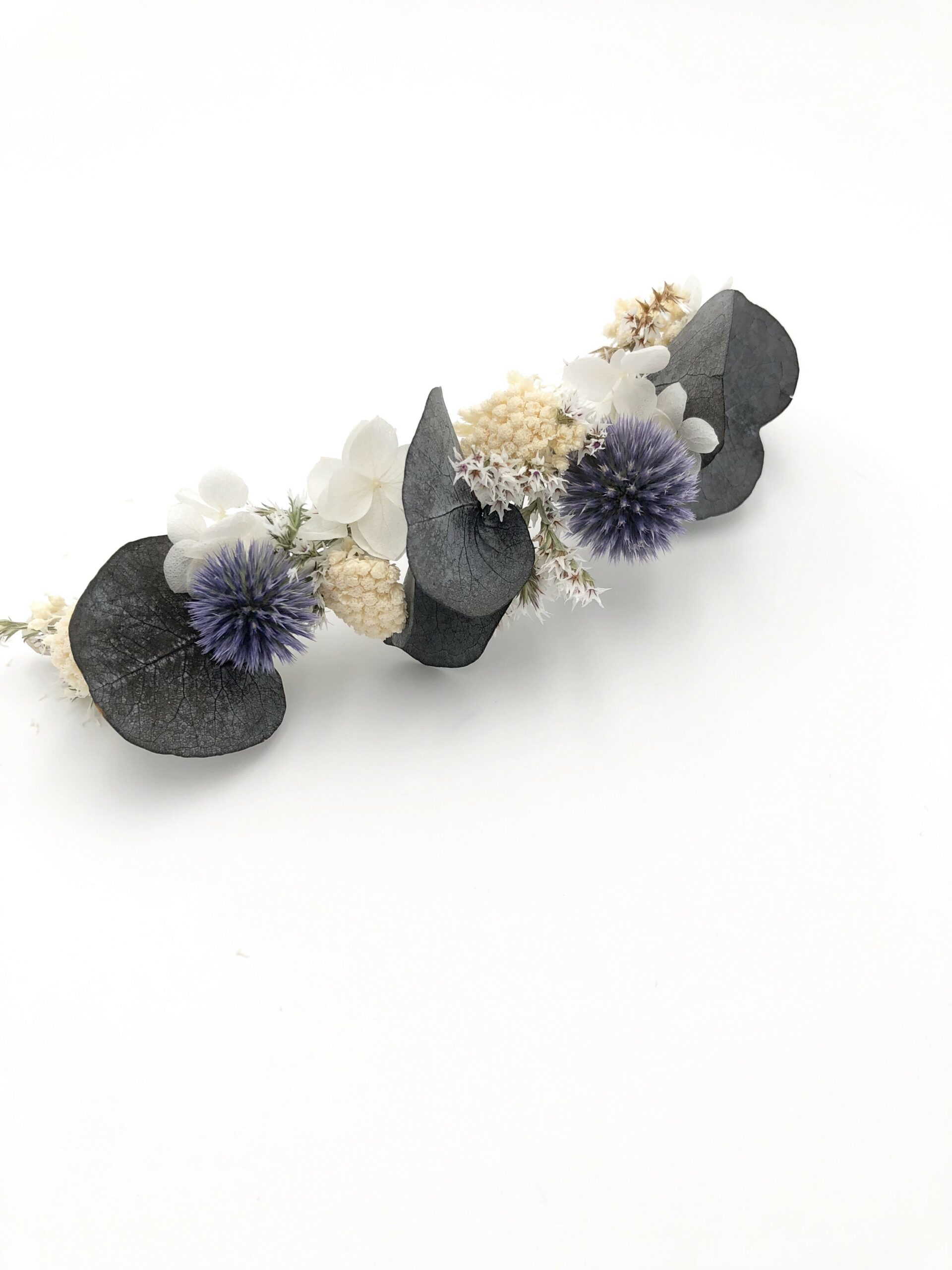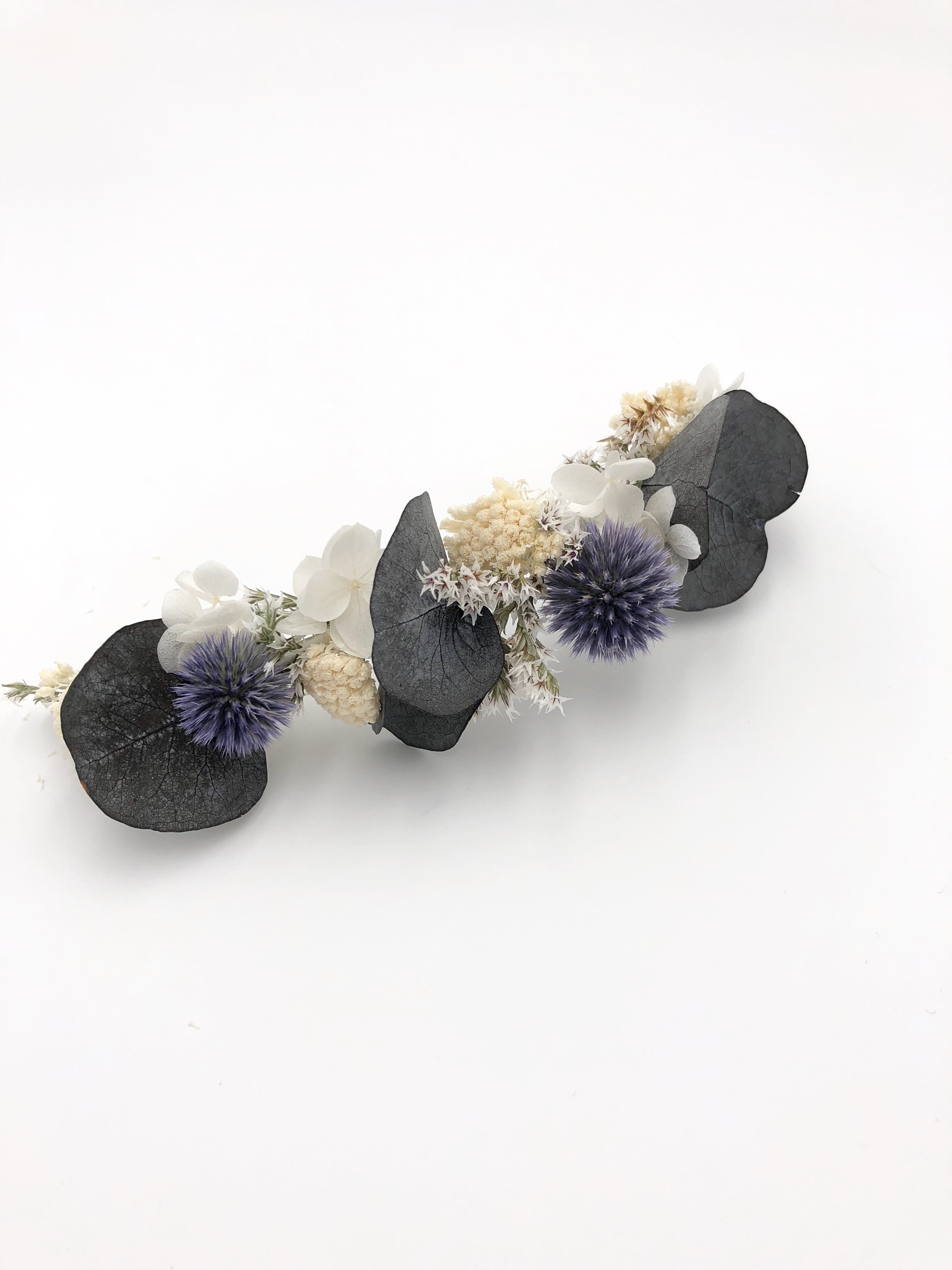 La barrette Céleste, comme tous nos accessoires, est confectionnée minutieusement à la main en France, à Lyon, à partir de fleurs séchées françaises et de fleurs stabilisées de qualité.