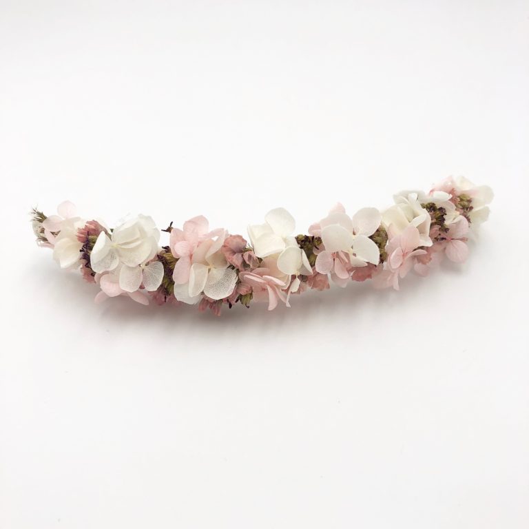 - Fleurs stabilisées haute-qualité (hortensias blanches et rose pâle)