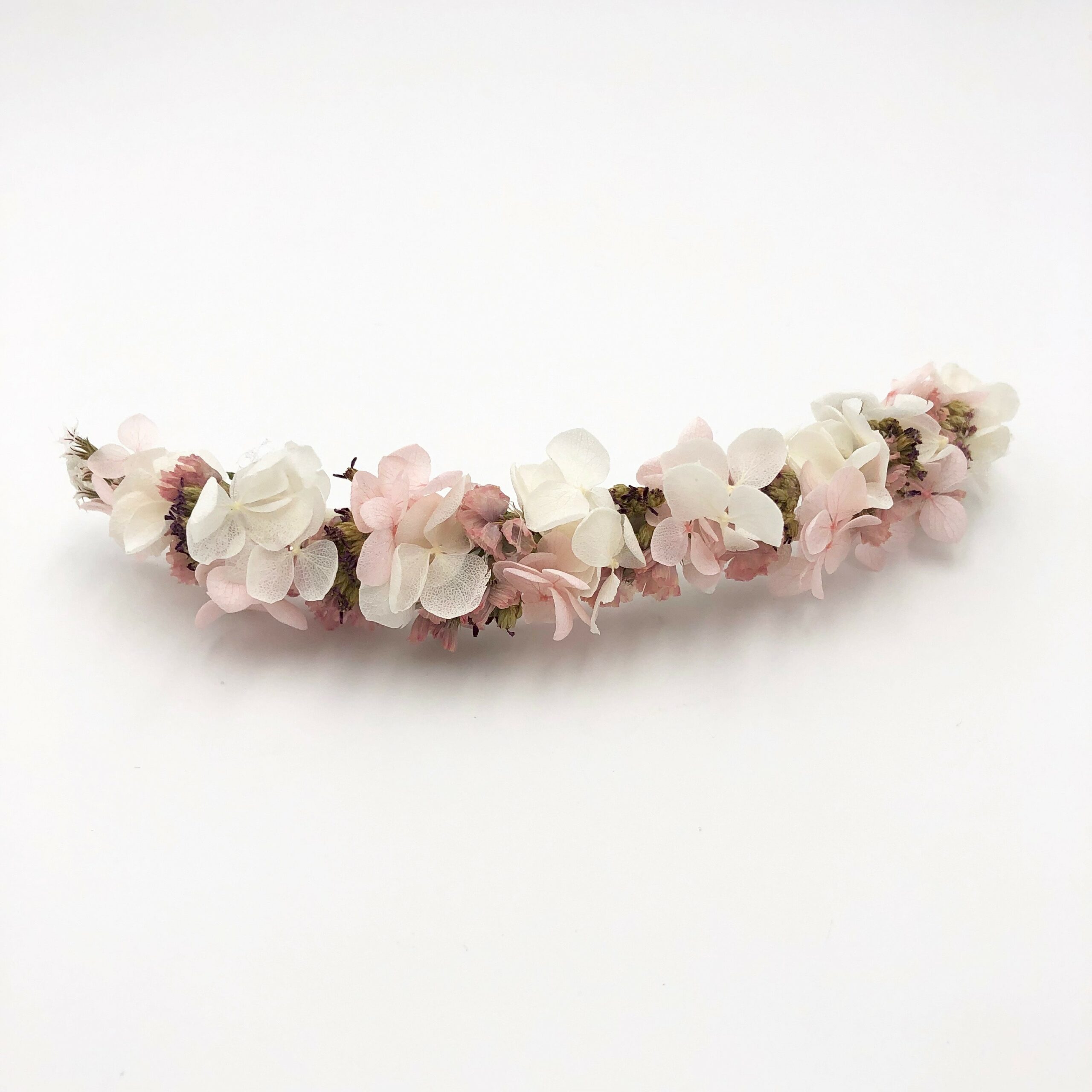 La barrette de mariée Lilla est un accessoire élégant et romantique. Ses petites fleurs d’hortensia blanches et rose pâle se marient avec légèreté aux statices roses. Elle fait partie de la gamme Lilla, qui se caractérise par des tons à la fois très pastel grâce aux hortensias rose pâle, mais équilibrés par des tonalités plus froides, grâce au vieux-rose des achillées et aux tons roses du statice.