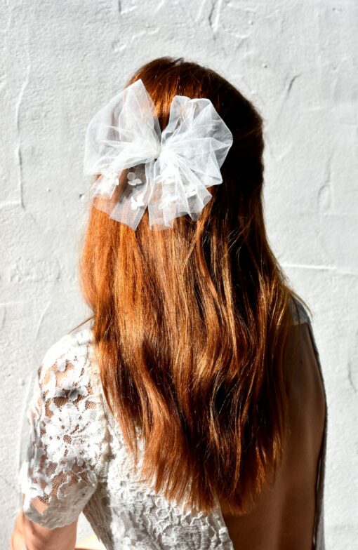 Notre nœud court en tulle blanc apporte le détail mode et la prestance à votre tenue de mariée. Celui-ci est agrémenté de quelques fleurs d’hortensias blancs en légères touches.