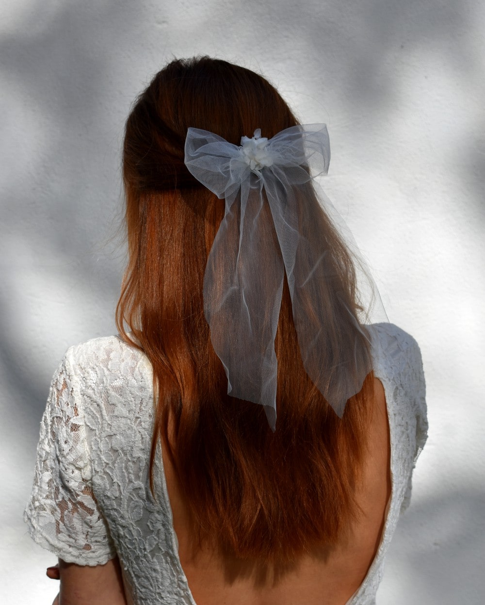 Ce nœud en fleurs stabilisées blanche est une création aux accents bohème, mais à l’esprit cérémonie, et pourra s’associer avec goût à votre robe. Très facile à porter et léger, il mettra en valeur une jolie coiffure, une demi-attache notamment si vous comptez porter vos cheveux détachés. Le tulle est une matière aérienne et transparente qui pourra s’associer à votre robe toute en subtilité. C’est aussi un petit clin d’œil à l’esprit voile de mariée sans en porter un.