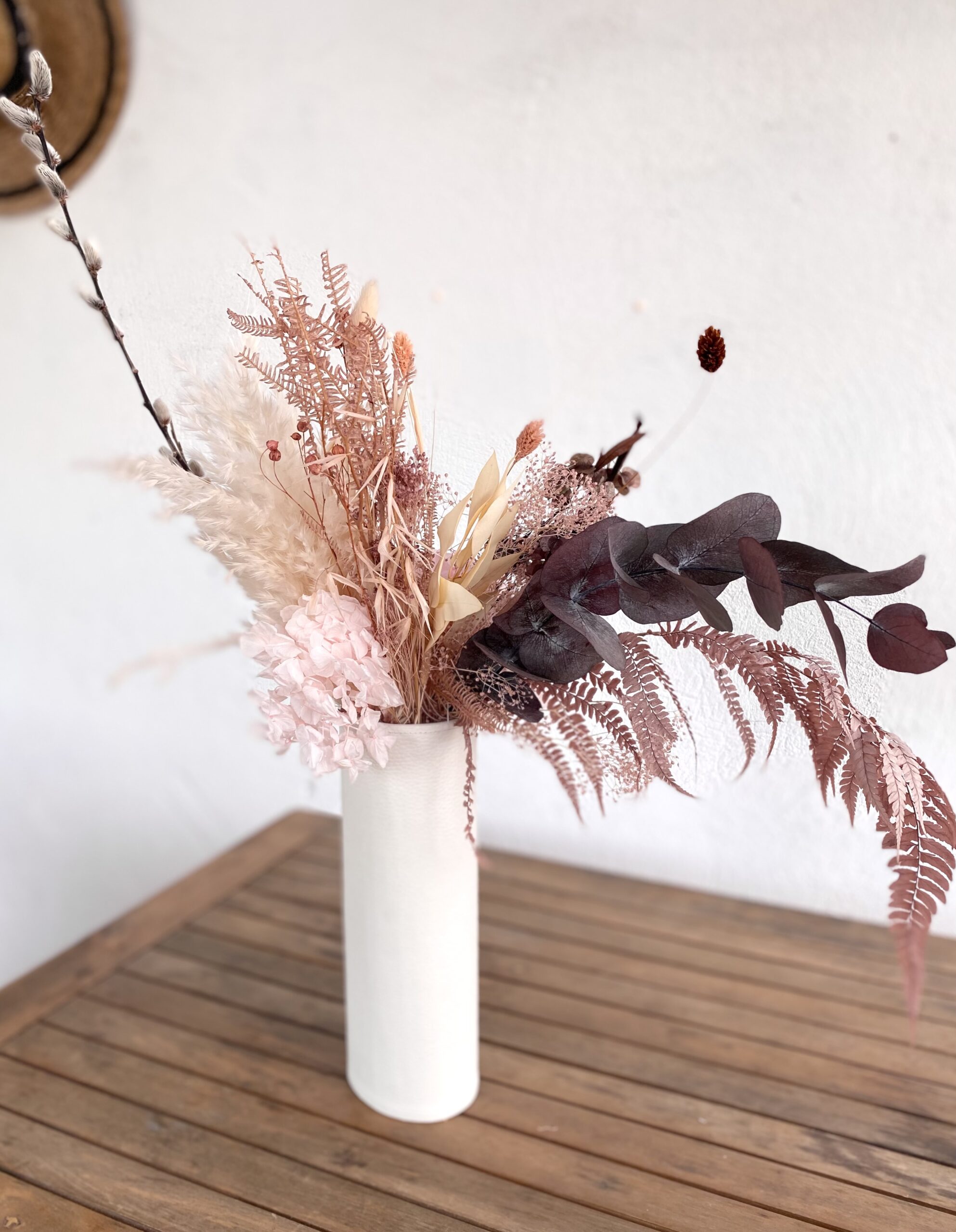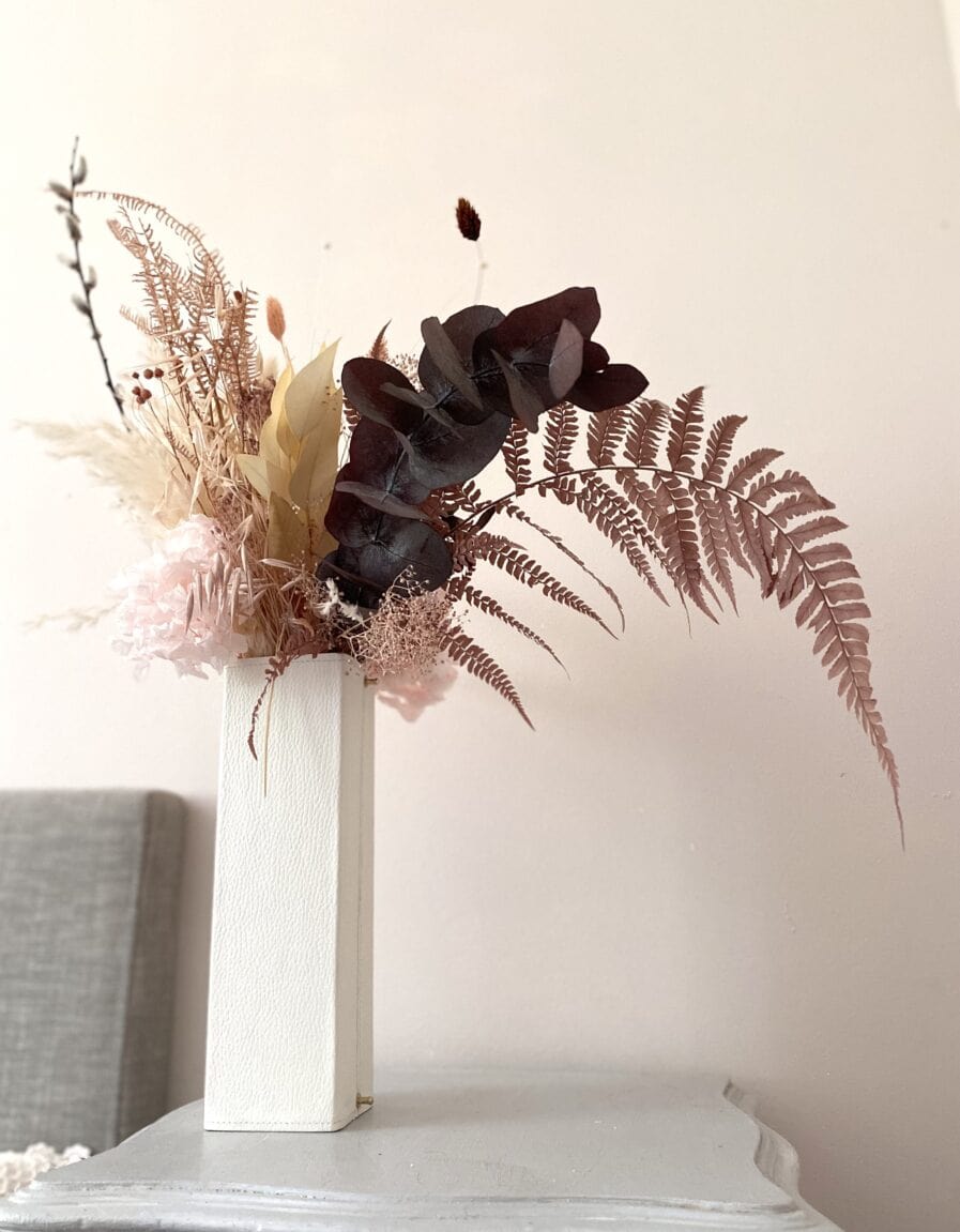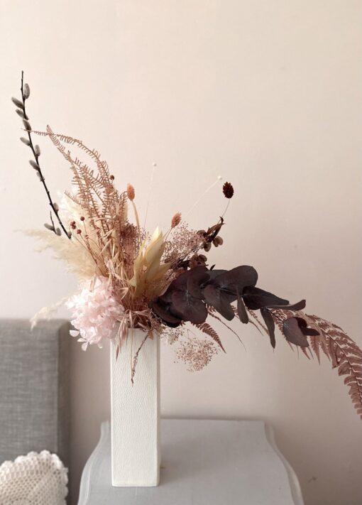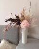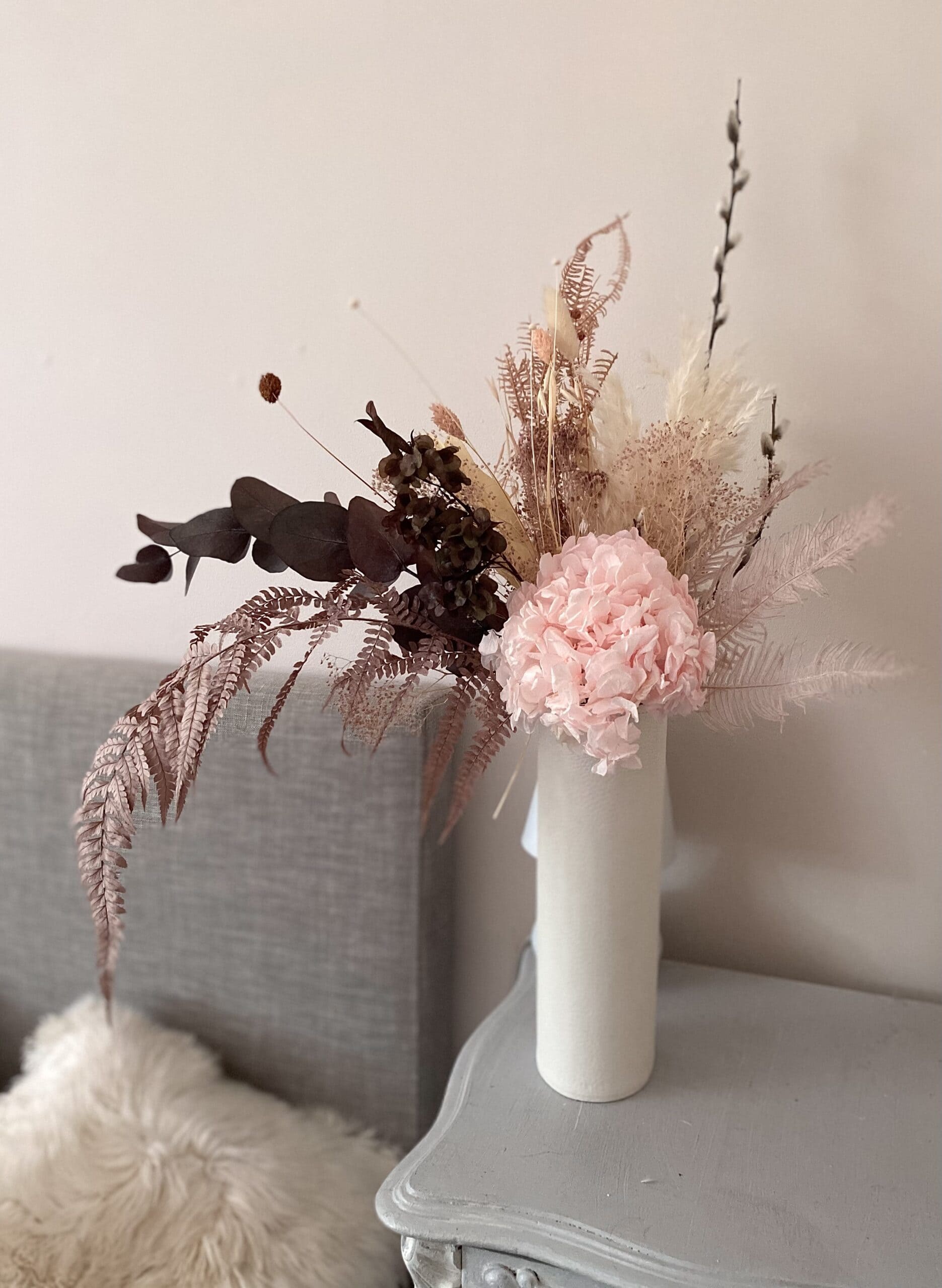 - Fleurs stabilisées et séchées naturelles (hortensias, mini-gypsophile, eucalyptus, pampa, avoine, fougère…)
