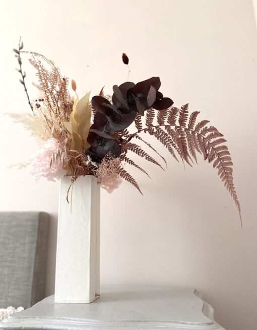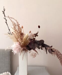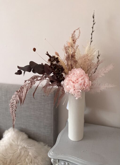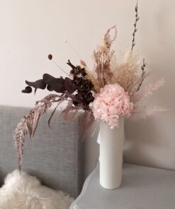 C’est un choix à la fois esthétique et pratique pour décorer un salon ou une chambre de façon originale et élégante, dans des tons rose, vieux-rose et blanc/ivoire. Ses différents apports de végétaux, comme l’eucalyptus, donnent une fraicheur appréciable sur une table ou un buffet, tandis que les hortensias donnent l’illusion parfaite de fleurs fraiches. Le mélange de teintes douces contrastées par les touches chocolat en font un bouquet féminin et délicat.