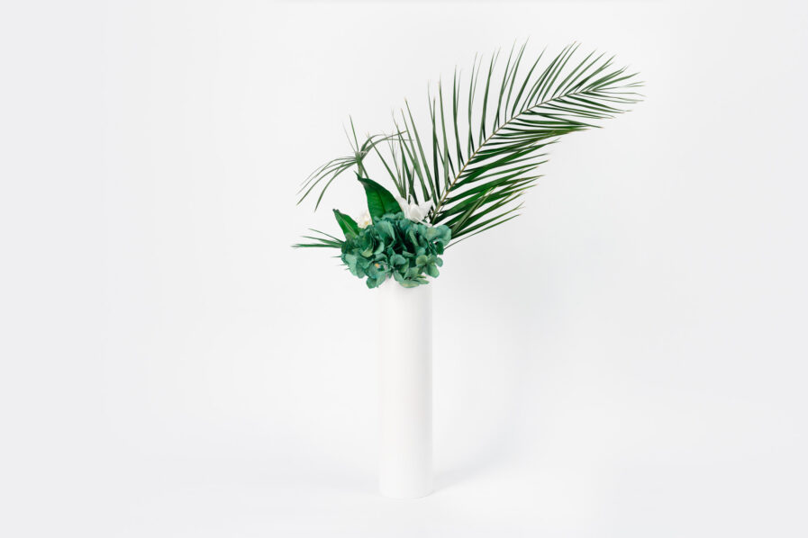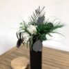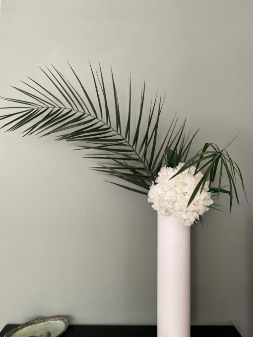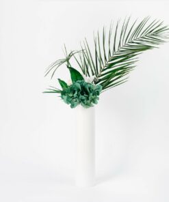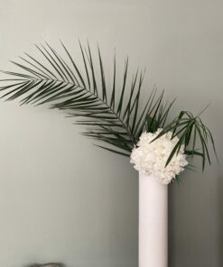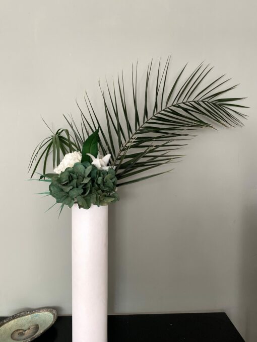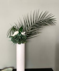 C’est un choix à la fois esthétique et pratique pour décorer un salon ou une chambre de façon originale et élégante, dans des tons chics blanc et vert. Ses différents apports de végétaux, comme l’eucalyptus, donnent une fraicheur appréciable sur une table ou un buffet, tandis que les hortensias donnent l’illusion parfaite de fleurs fraiches. La présence d’une grande palme sur ce bouquet plonge dans un imaginaire plus tropical, et donne un ensemble luxuriant et chic, avec un côté plus majestueux.