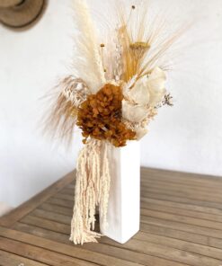 D’une part, vous n’avez besoin d’aucun entretien pour cette composition, ni eau, ni besoins en lumière, et les fleurs stabilisées, étant non statiques, éloignent la poussière, contrairement à des bouquets 100% séchés. De plus, c’est un choix écoresponsable, car vous évitez d’acheter et jeter chaque semaine des bouquets de fleurs fraiches, tout en disposant d’une décoration naturelle et fraiche.