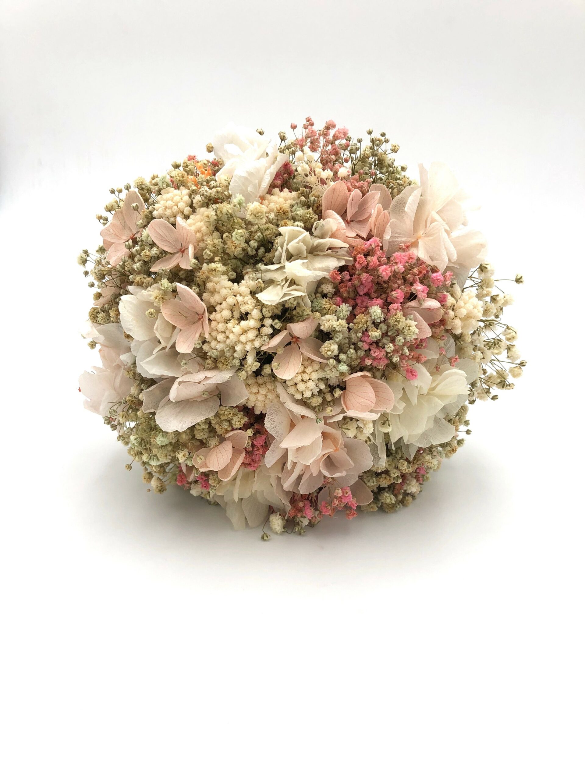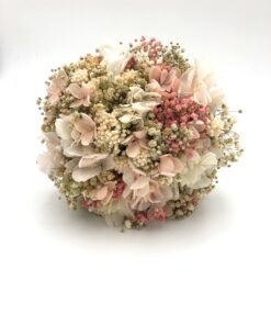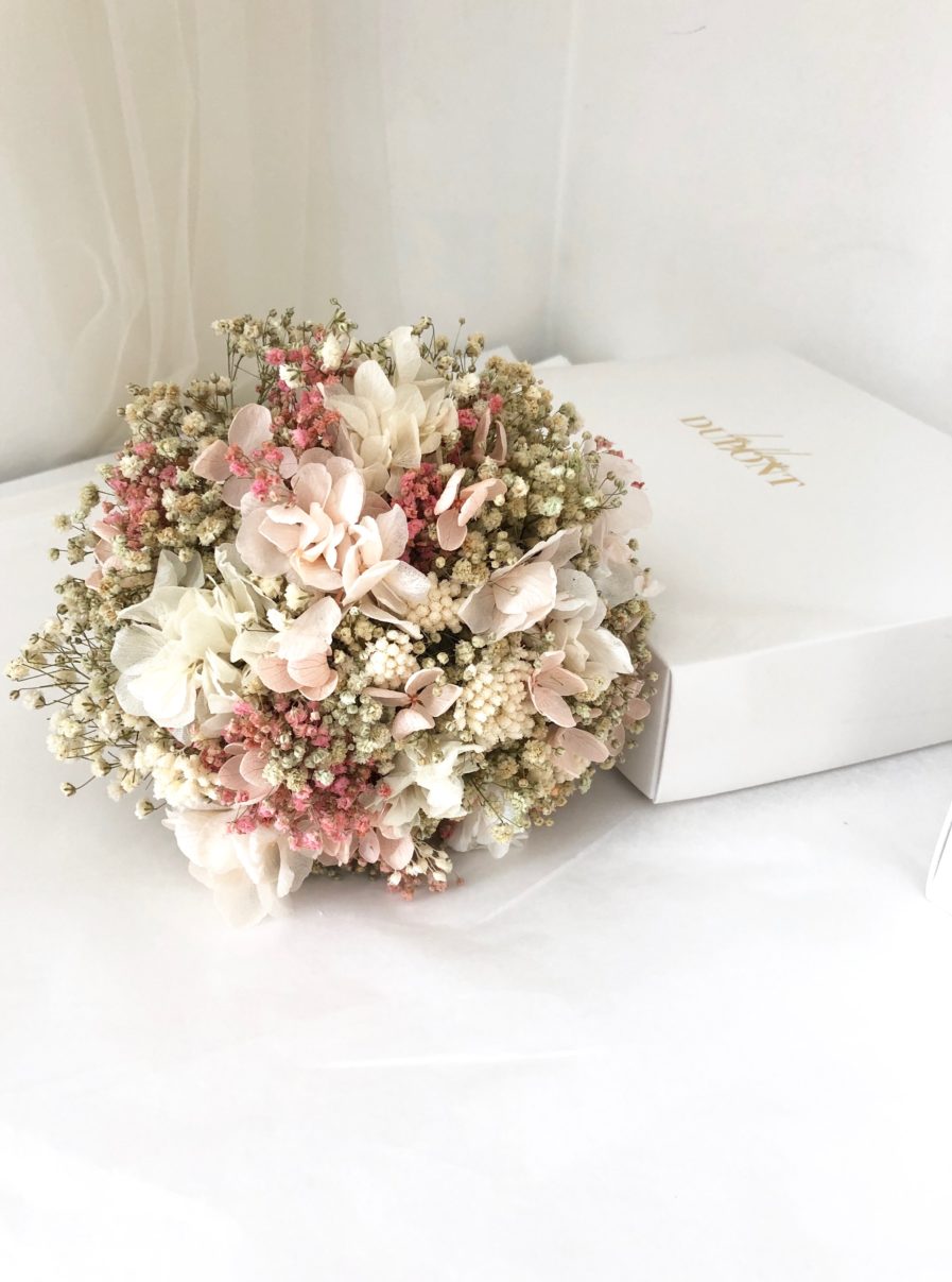 - Fleurs stabilisées (hortensias blanches, hortensia rose, achillées ivoire, gypsophile blanc, gypsophile rose)