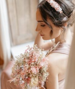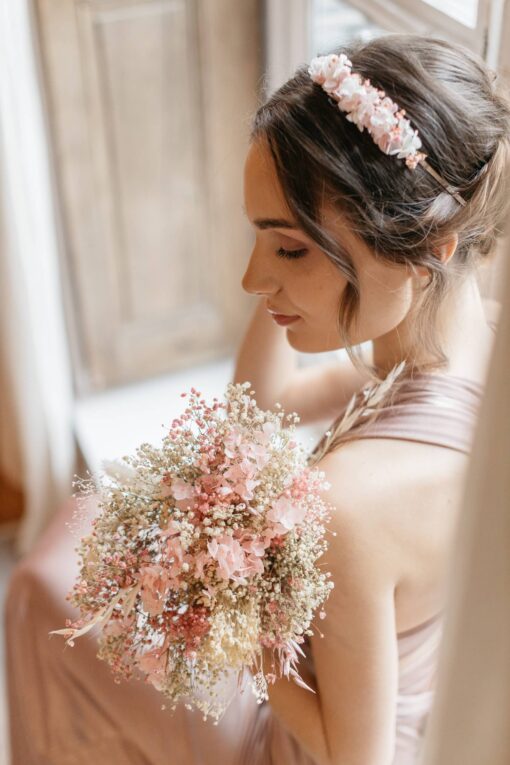 Le bouquet en fleurs séchées Candi est à la fois pratique et esthétique. Pratique car vous pouvez le commander en avance, en évitant ainsi le stress de conservation du bouquet en prévision du Jour J : en effet, étant composé de fleurs séchées, il peut se conserver plusieurs mois, voire plusieurs années à l’abri de la lumière directe. De même, il vous permet d’assortir votre accessoire de tête, comme la couronne Candi, avec vos demoiselles d’honneur, le futur marié, mais également le bouquet, pour un effet des plus chics. Ce bouquet en fleurs stabilisées et séchées est en plein dans la tendance actuelle des petits bouquets de mariée ou de déco au style bohème et chic.