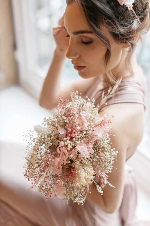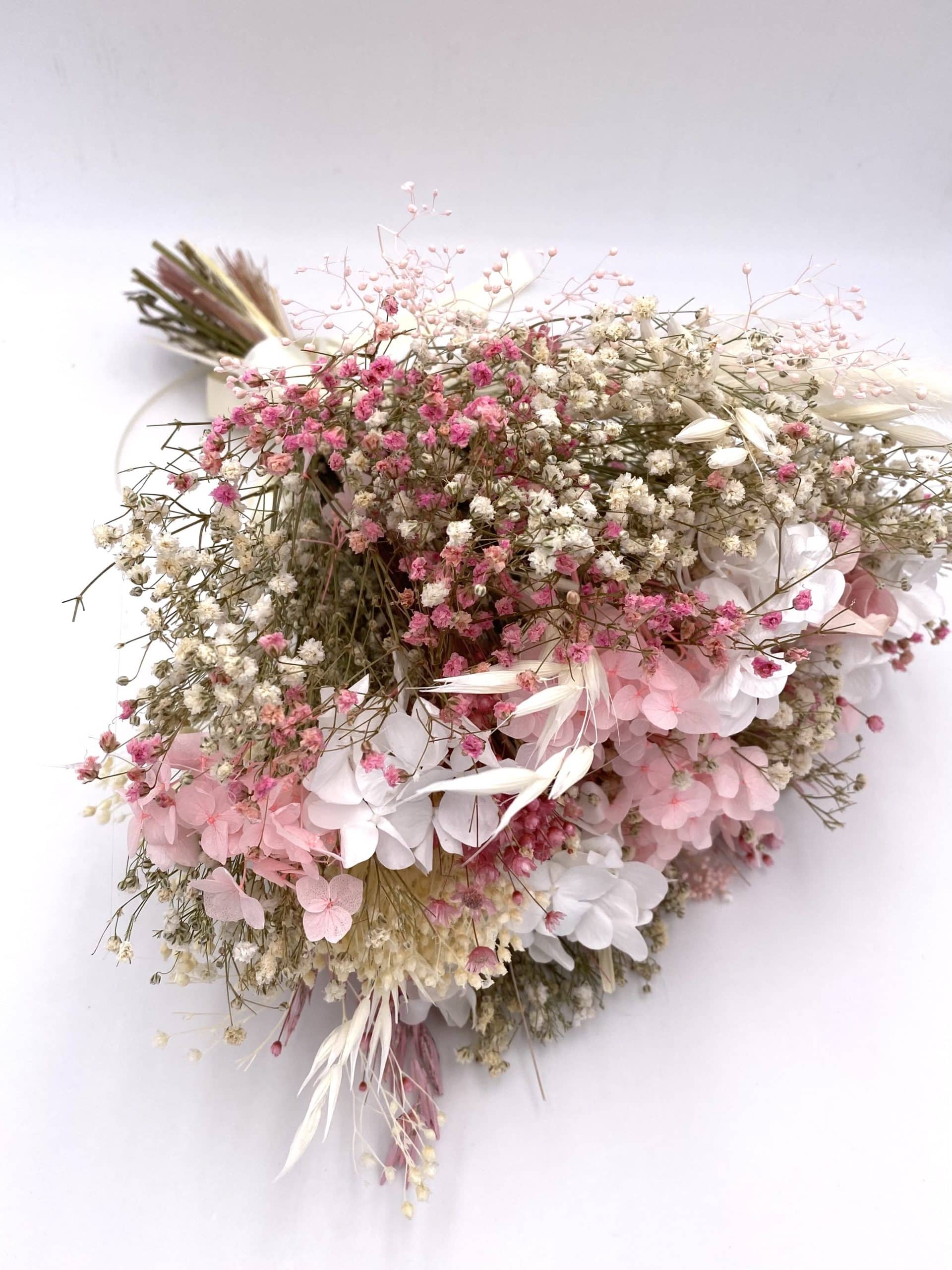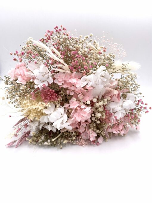 Il se distingue par des tons sucrés blancs et roses, dans un esprit romantique et chic, une pièce indémodable pour tout mariage ! Il se compose de brins de gypsophile stabilisé blanc, de brins de gypsophile stabilisé rose, et de différentes déclinaisons de petites fleurs séchées roses et blanches, comme la marcela, l’avoine, le limonium ou encore le lin et la pampa.