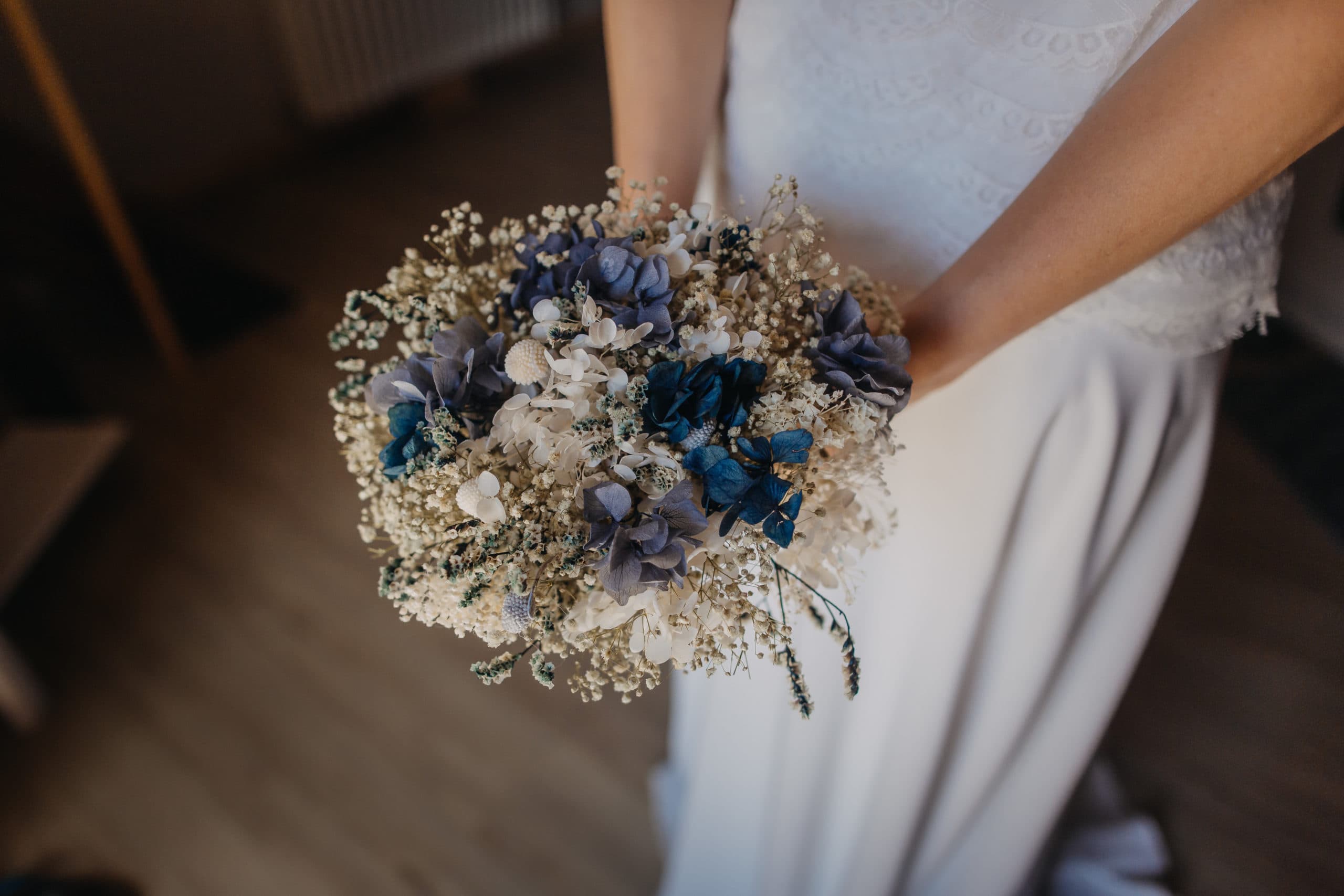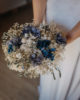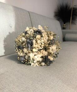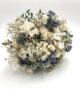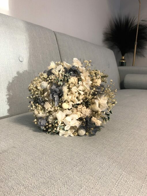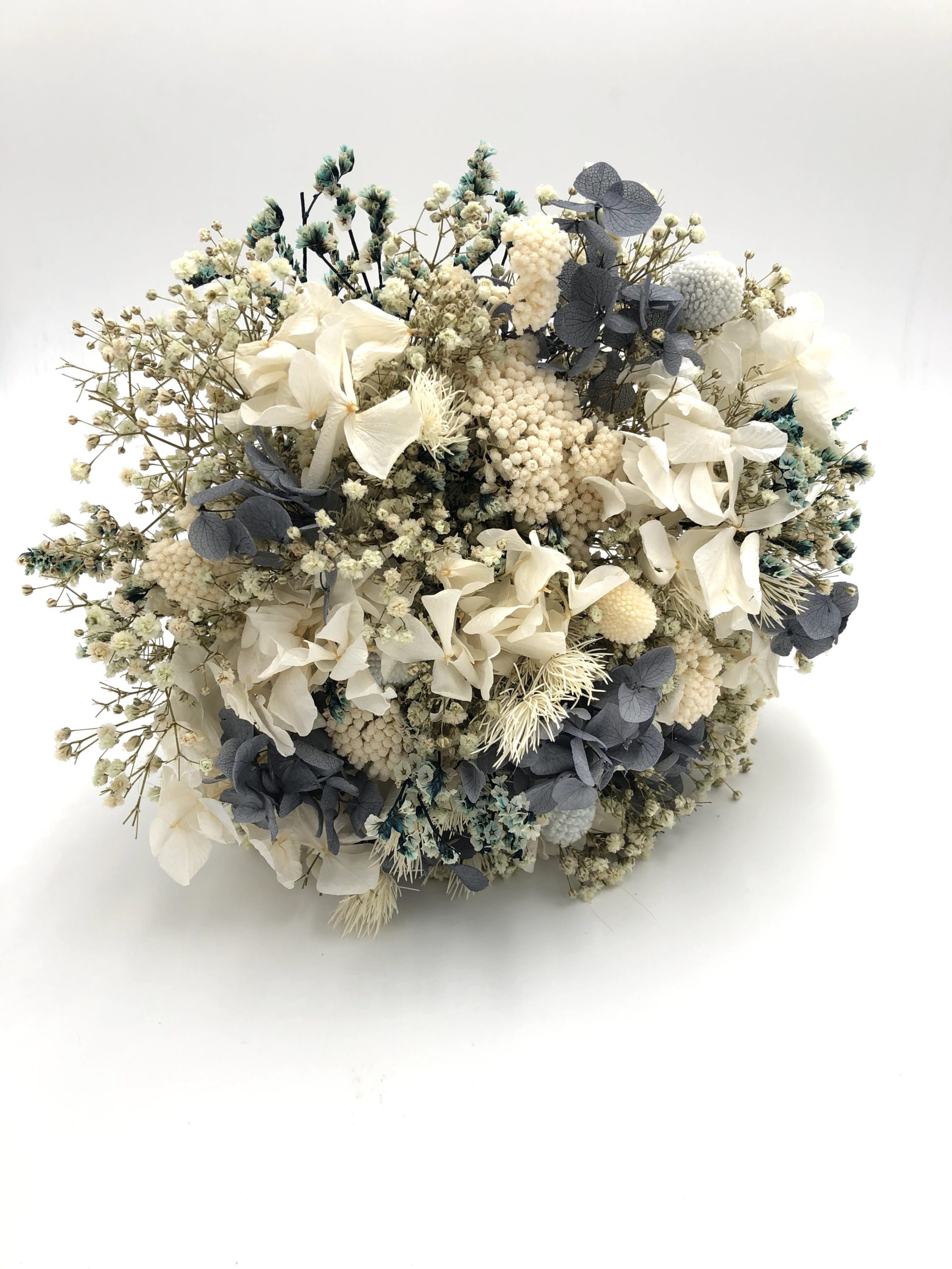 - Fleurs séchées et stabilisées (hortensias blanc et bleu horizon, achillées ivoire, gypsophile blanc, craspedias bleues, limonium bleu-vert)
