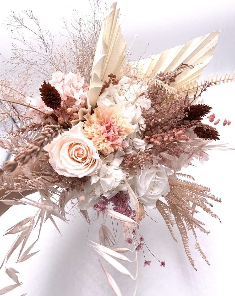 - Fleurs stabilisées et séchées naturelles (roses, oeillet, hortensia mini, mini-gypsophile, marcella, herbe sauvage, palmes, phalaris, billes de lin…)
