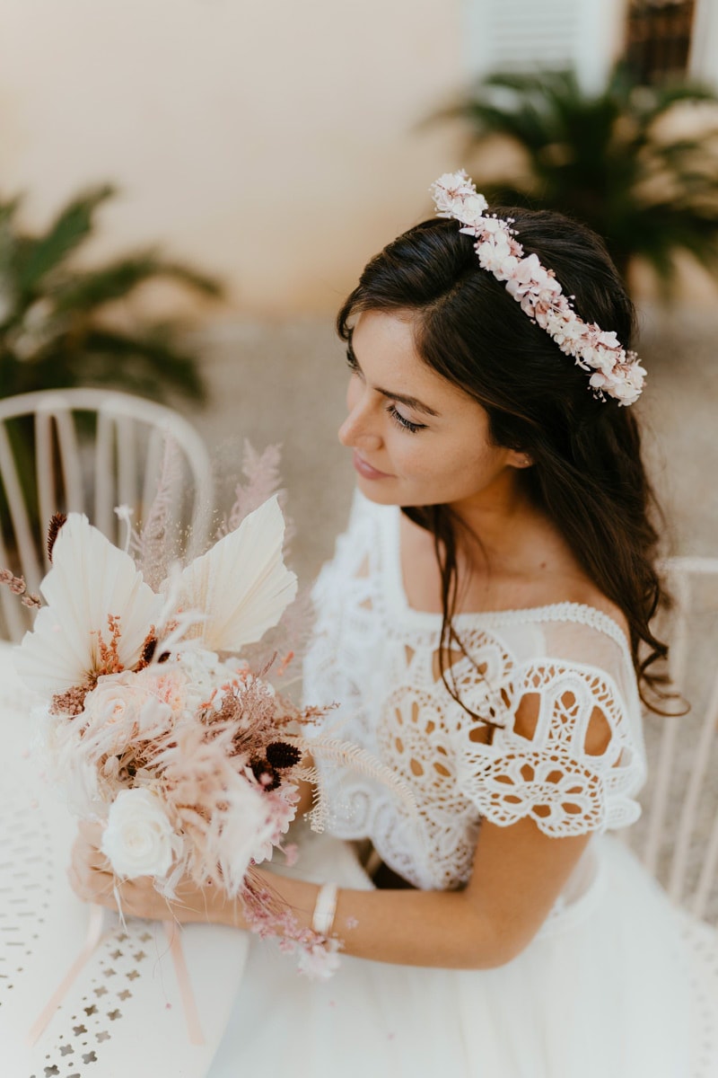 Entre herbes sauvages, hortensias vieux rose, billes de lin, avoines, et gypsophiles, le bouquet en fleurs stabilisées Chérie fait la part belle aux fleurs délicates et féminines, aux doux dégradés de couleurs, et à une vision romantique et actuelle du mariage.