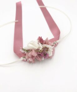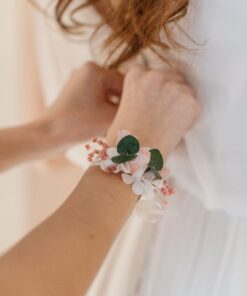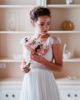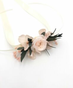 Ce bouquet en fleurs naturelles durables est idéal pour assortir la mariée à son cortège dans la gamme Confetti par exemple, mais aussi à son accessoire de cheveux. Les gammes Lima ou encore Candi pourront aussi bien s’assortir de façon élégante à ce bouquet.