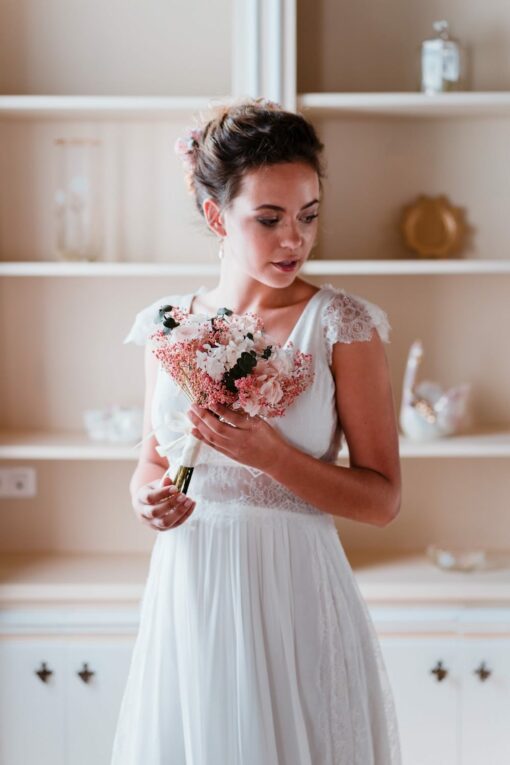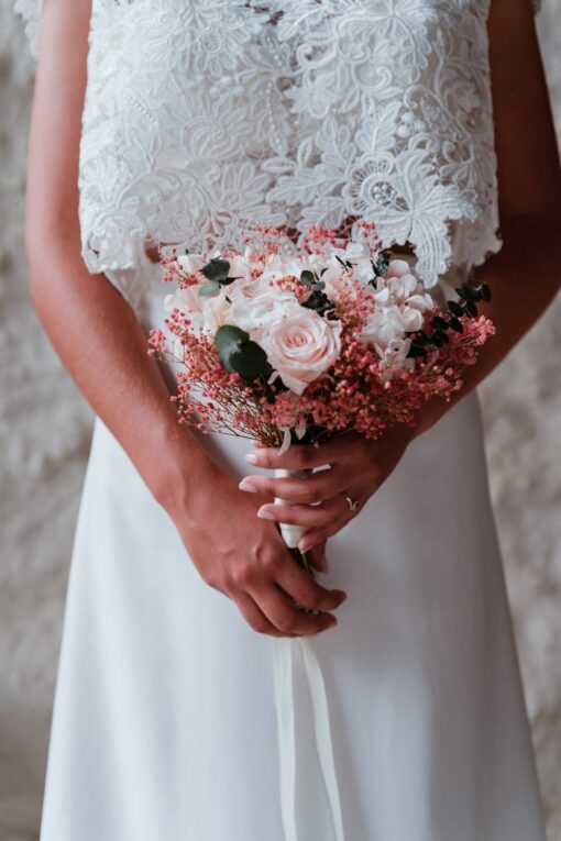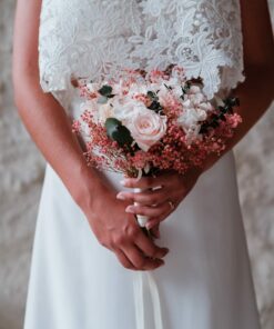 Composé à 100% de fleurs stabilisées, c’est un bouquet pratique, car il peut être commandé plusieurs mois à l’avance, ce qui permet par exemple, de l’utiliser pour un essayage de robes de mariées en situation réelle. Aussi, c’est un formidable souvenir qu’il sera possible de conserver après le mariage, durant des mois voire des années.
