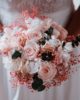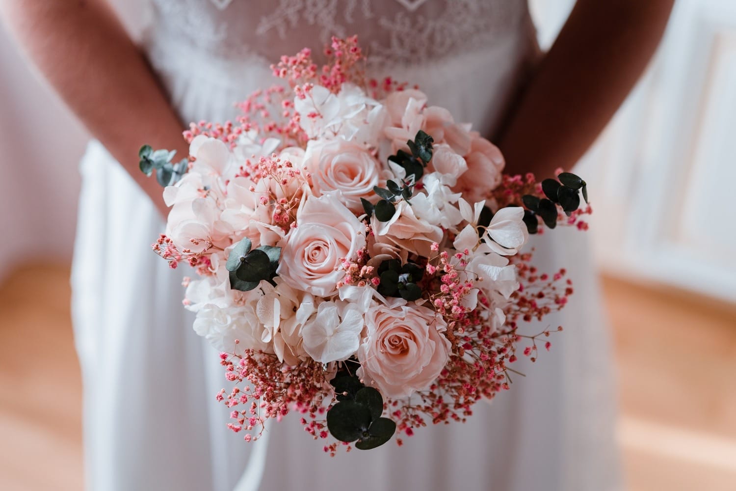 - composé de roses rose pâle, d’eucalyptus, d’hortensias blanc et rose, gypsophile rose
