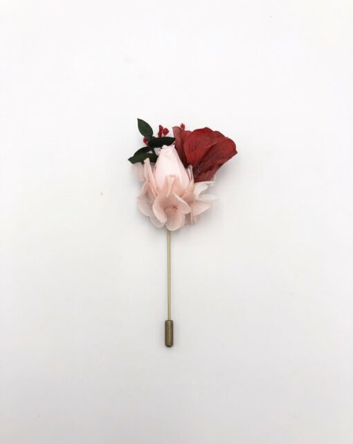 La boutonnière broche Arabesque se compose ainsi de plusieurs fleurs stabilisées : des hortensias stabilisées bordeaux/rouge, rose pâle et blanc, ainsi que des feuilles d’eucalyptus baby blue, un bouton de rose stabilisée rose pâle et des touches de broom stabilisé rouge. C’est un accessoire très frais et estival, aux allures festives et distinguées, qui ajoutera une touche colorée très chic à votre costume.