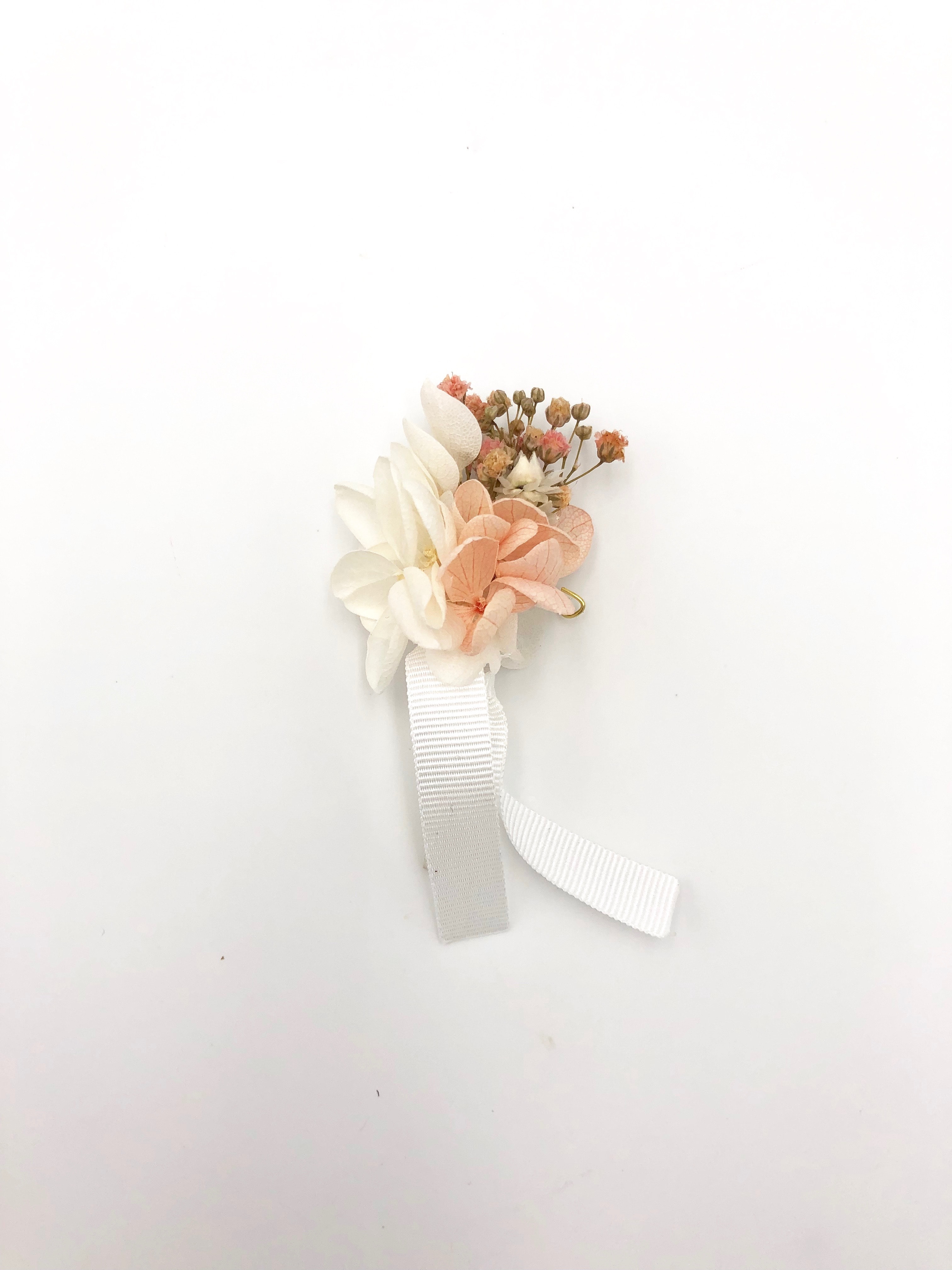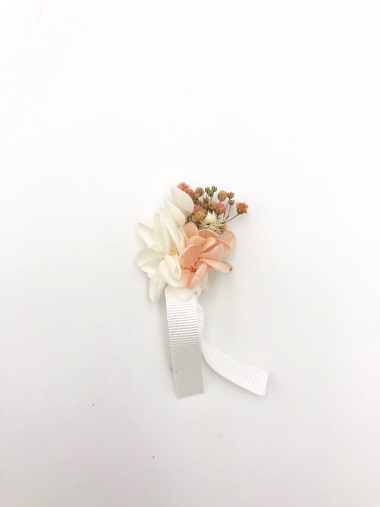 La boutonnière en fleurs Candi fait partie de la collection Romantique créée pour 2018. Délicatement coloré de ton doux et sucrés rose et blanc, cet accessoire est un mélange harmonieux de plusieurs fleurs séchées et stabilisées, et se conservera durant plusieurs années. Elle associe ainsi des branches de gypsophile stabilisé de couleur rose poudré, aux touches pêche et corail, des pétales d’hortensia stabilisé blanc et des boutons d’ammobium séché. La gamme Candi, de la collection Romantique, offre une touche sucrée, cristallisée et romantique à votre tenue, en plein dans la tendance, pour vous associer à la mariée.