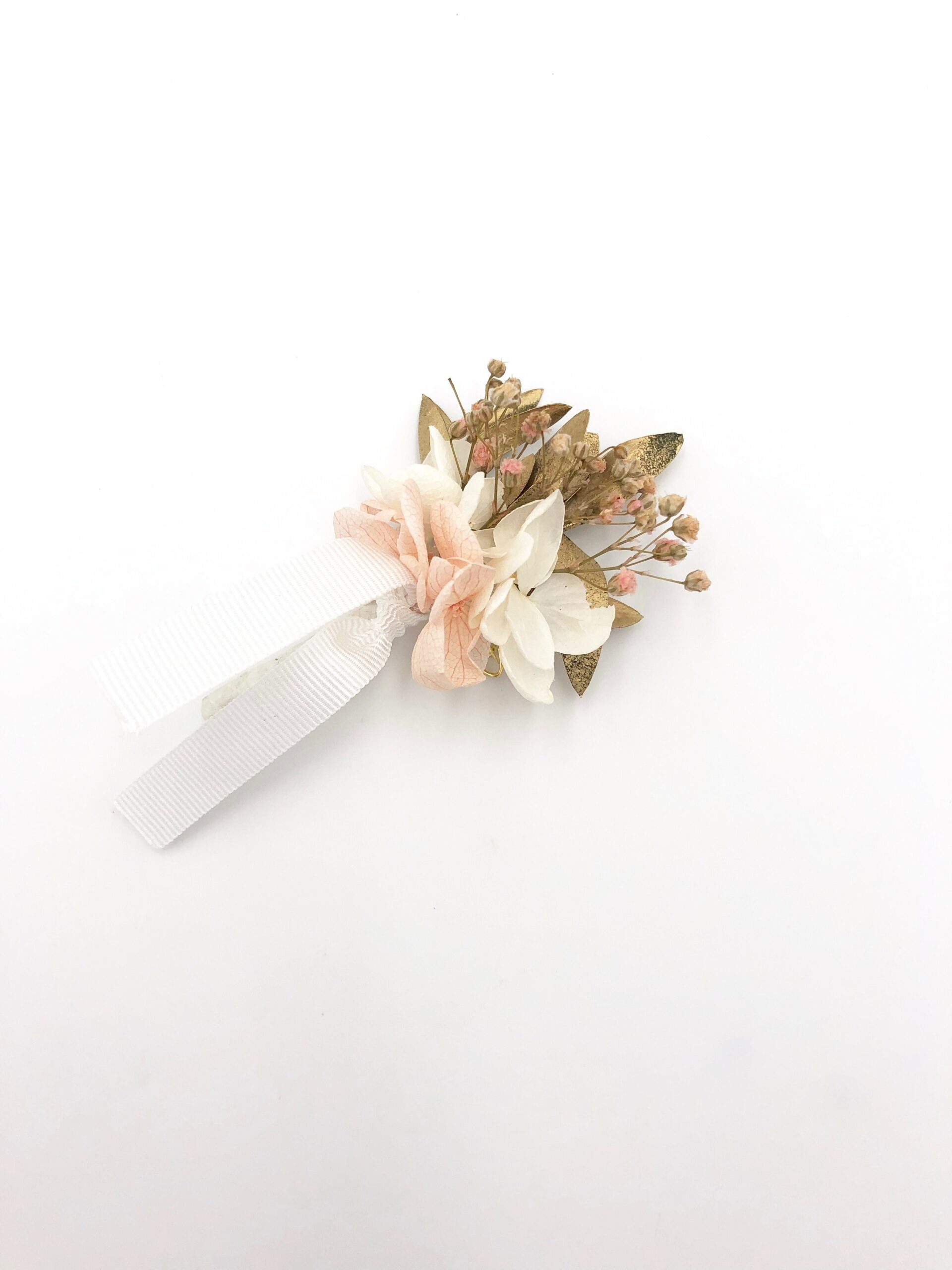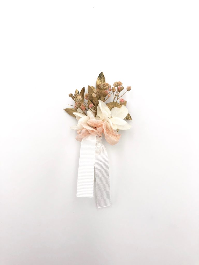 La boutonnière en fleurs Candi dorée fait partie de la collection créée pour 2018. Délicatement coloré de ton doux et sucrés rose, doré et blanc, cet accessoire est un mélange harmonieux de plusieurs fleurs séchées et stabilisées, et se conservera durant plusieurs années. Elle associe ainsi des branches de gypsophile stabilisé de couleur rose poudré, aux touches pêche et corail, des pétales d’hortensia stabilisé blanc et des boutons d’ammobium séché, assortis à des brins de lin séché et doré. La gamme Candi dorée, de la collection Romantique, offre une touche sucrée, cristallisée et romantique à votre tenue, en plein dans la tendance 2018, pour vous associer à la mariée.