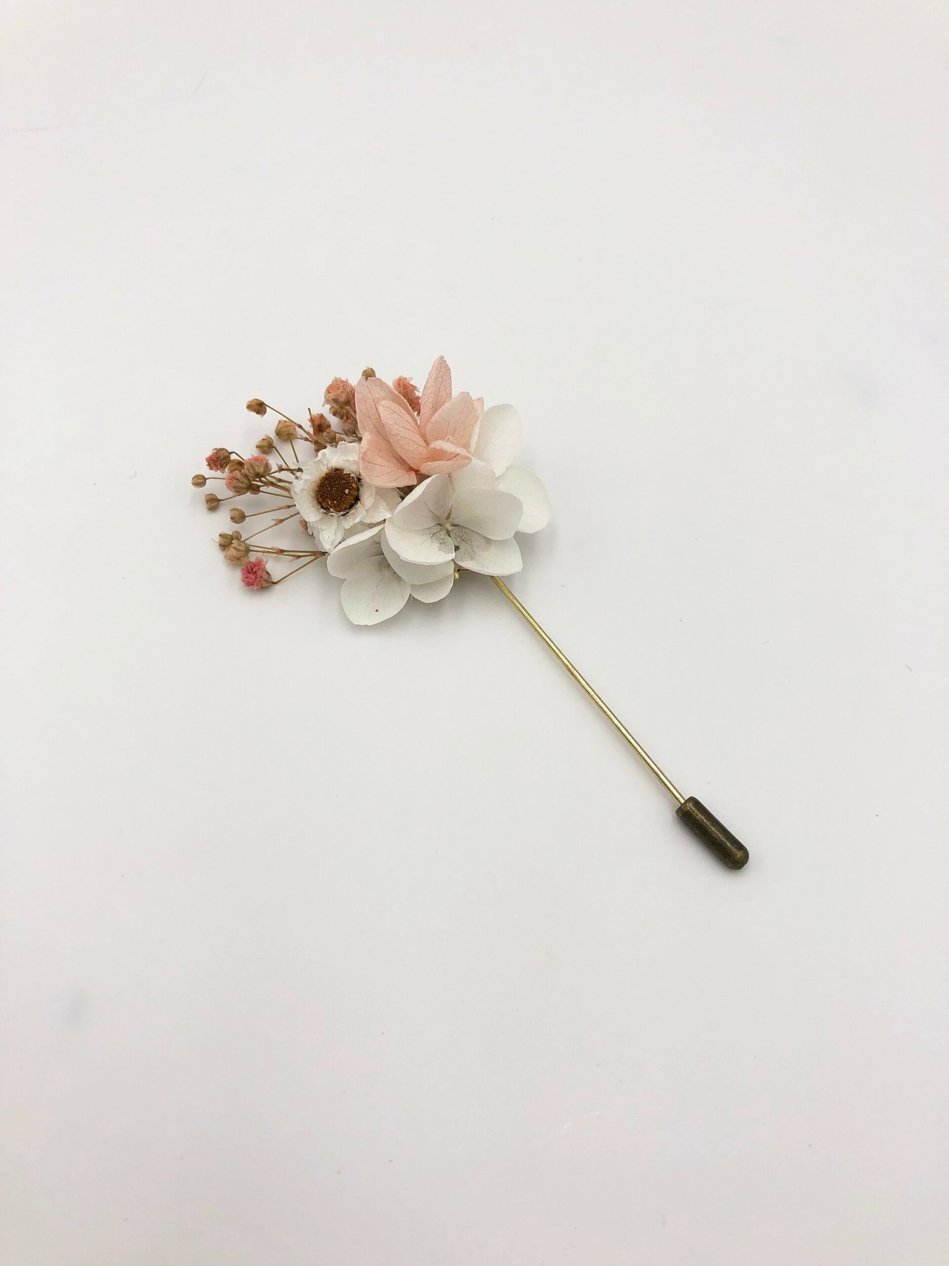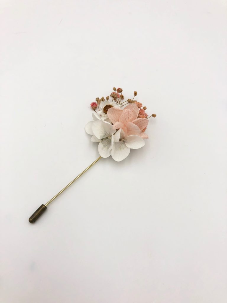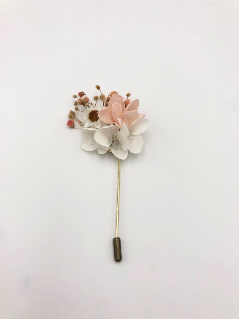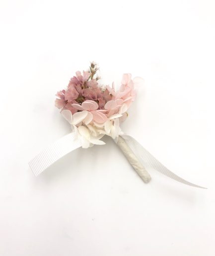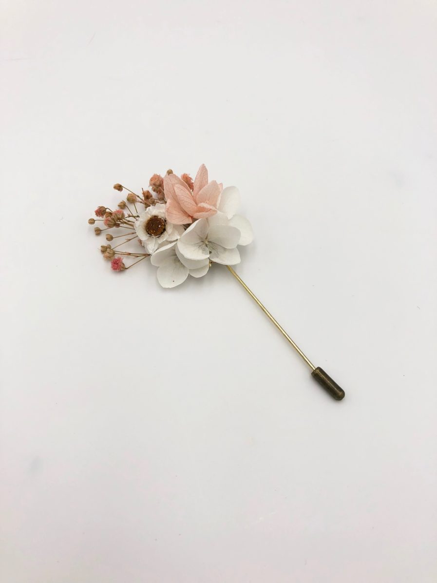 La boutonnière de mariage Candi fait partie de la collection Romantique. Délicatement coloré de ton doux et sucrés rose et blanc, cet accessoire est un mélange harmonieux de plusieurs fleurs séchées et stabilisées, et se conservera durant plusieurs années. Elle associe ainsi des branches de gypsophile stabilisé de couleur rose poudré, aux touches pêche et corail, des pétales d’hortensia stabilisé blanc et rose pâle, et des boutons d’ammobium séché. La gamme Candi, de la collection Romantique, offre une touche sucrée, cristallisée et romantique à votre tenue, en plein dans la tendance, pour vous associer à la mariée.