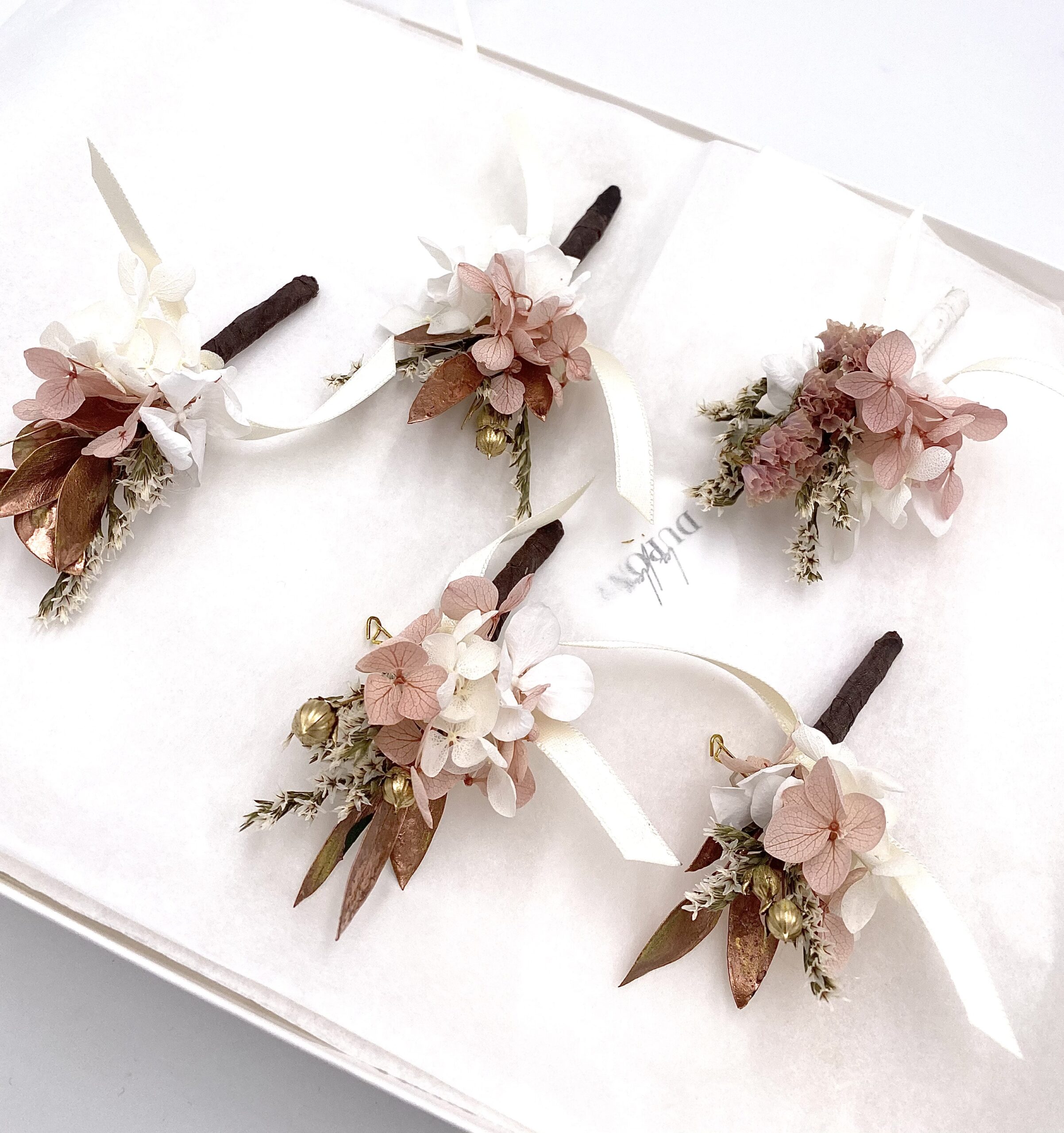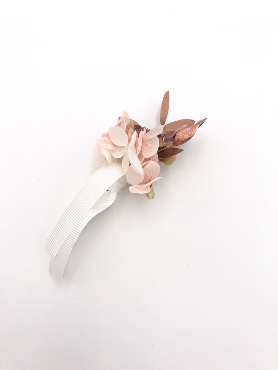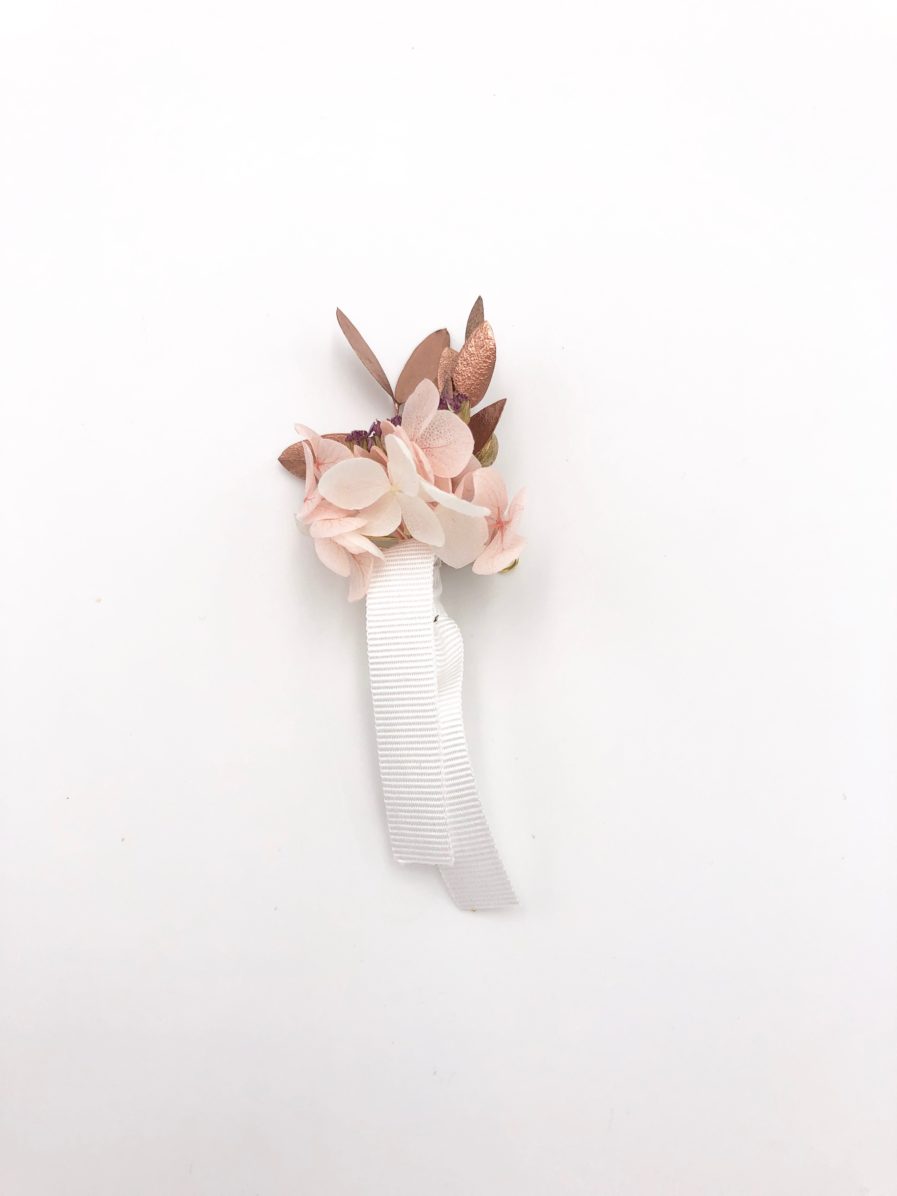 Cet accessoire de marié et témoins en fleurs séchées et en fleurs stabilisées s’associe prodigieusement à tout type de costume. Avec la tendance du cuivré pour les mariages, la boutonnière de fleurs Phyra trouvera une place de choix au sein de votre cérémonie.