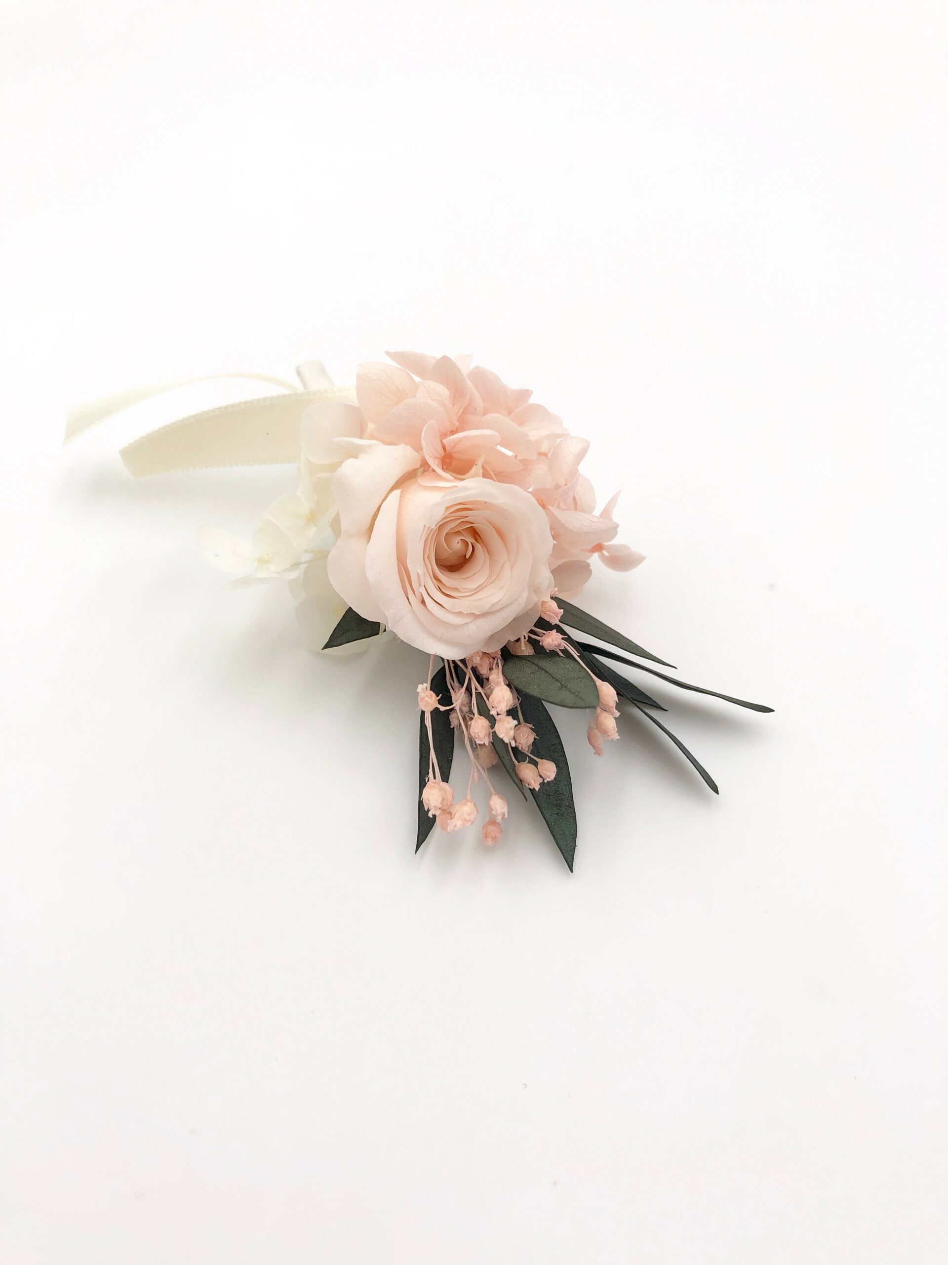 La boutonnière de marié Lima fait partie de la collection romantique, et il se distingue par son contraste entre les tons rose pastel et le végétal de l’eucalyptus. Romantique et chic, le peigne de fleurs Lima est un mélange délicat de plusieurs fleurs stabilisées, et se conservera durant plusieurs années. Il associe ainsi une petite rose stabilisée, des pétales d’hortensia, de l’eucalyptus et du broom. La gamme Lima, de la collection Romantique, offre une touche très pastel et romantique à votre tenue.