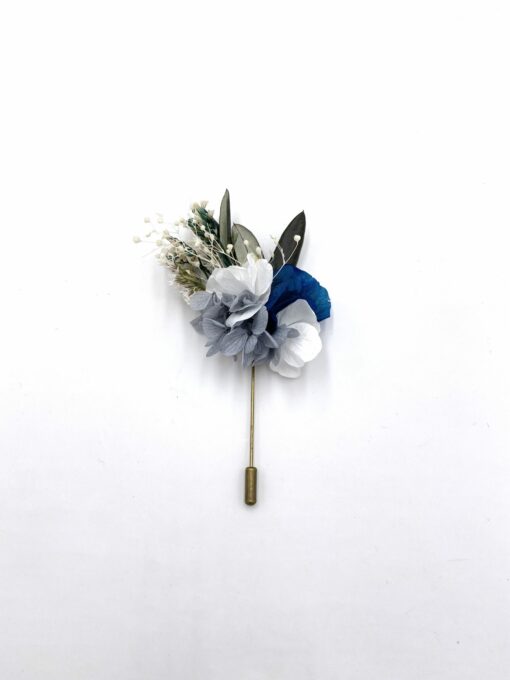 La boutonnière broche Acqua en fleurs stabilisées fait partie de la collection Acqua, une gamme d’accessoires déclinés autour des tonalités rafraichissantes de bleu-vert, à la fois douces et estivales.