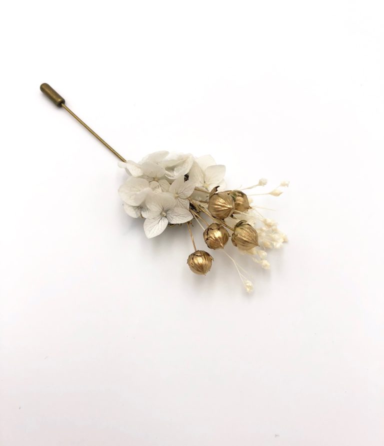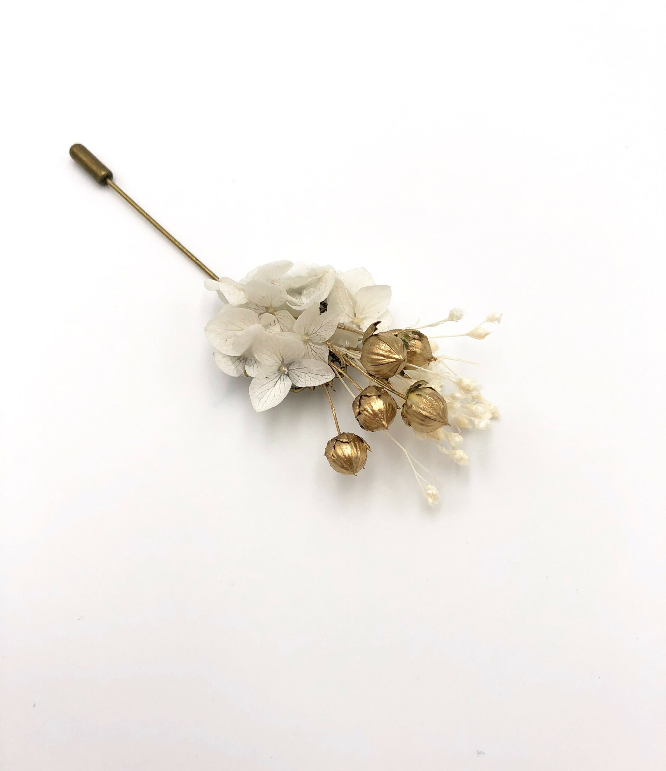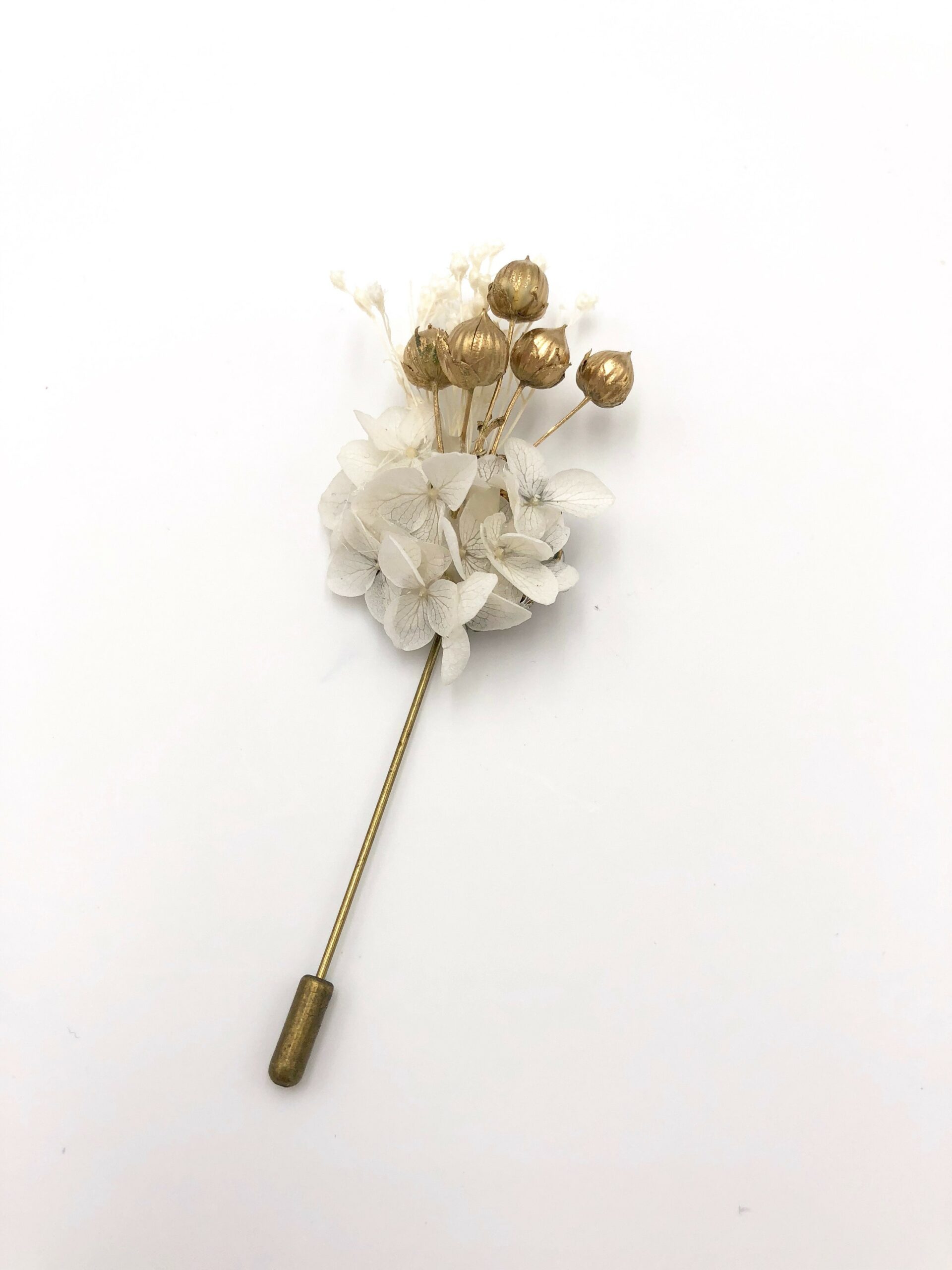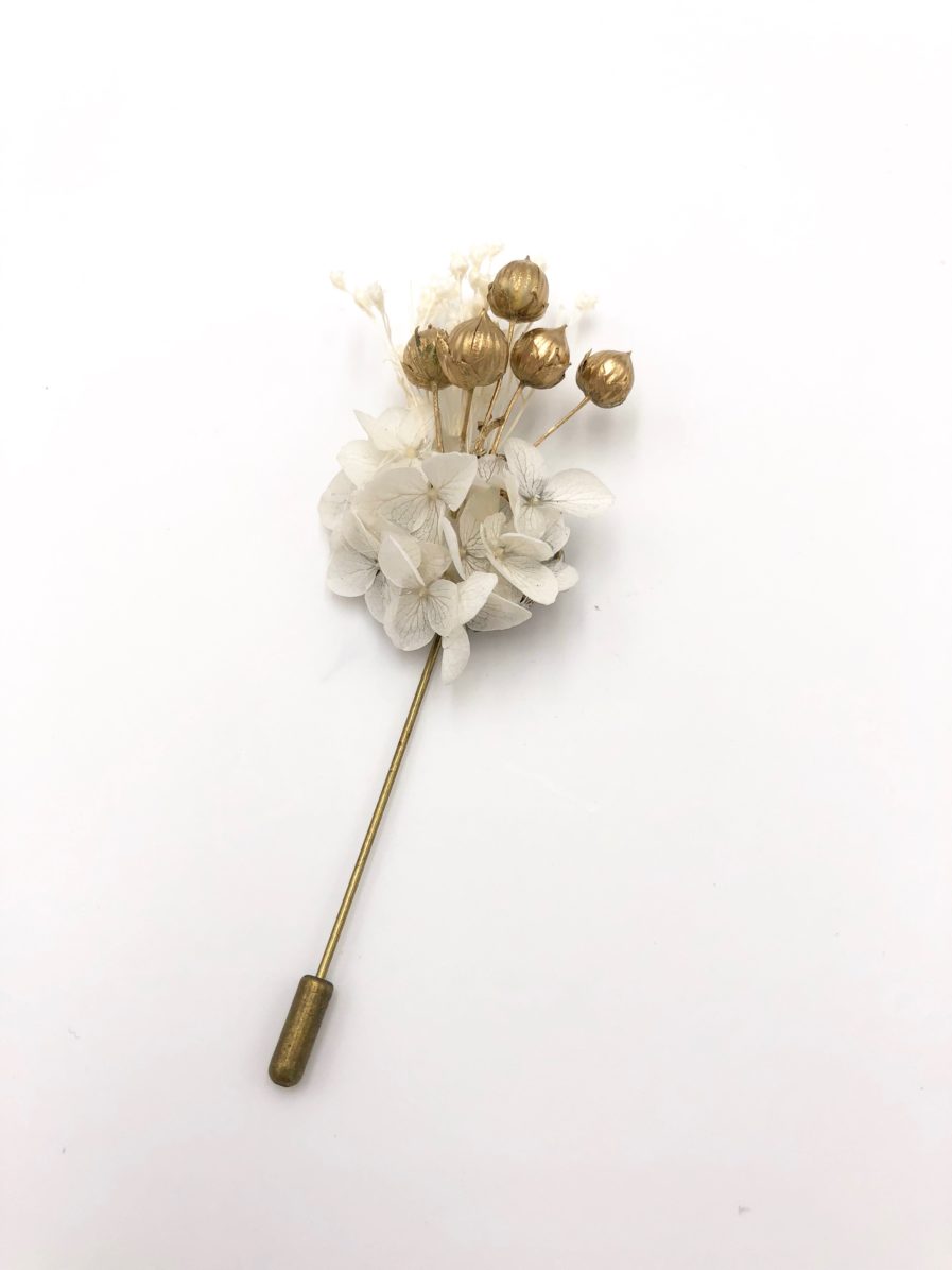 Avec son système de fermoir à broche sécurisé, très facile à mettre en place, la boutonnière en fleurs Aura Faustin sublimera n’importe quelle tenue, sans abîmer le tissu, et conviendra aussi bien aux mariés les plus chics, qu’à leurs témoins les plus trendy, sans oublier les gentlemen de tous les jours qui souhaitent ajouter une touche de fleurs subtile à leur veste en tweed. Elle est composée de fleurs séchées et stabilisées, aux tons dorés et blancs, avec ses billes de lin dorées et ses hortensias stabilisées.