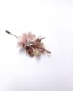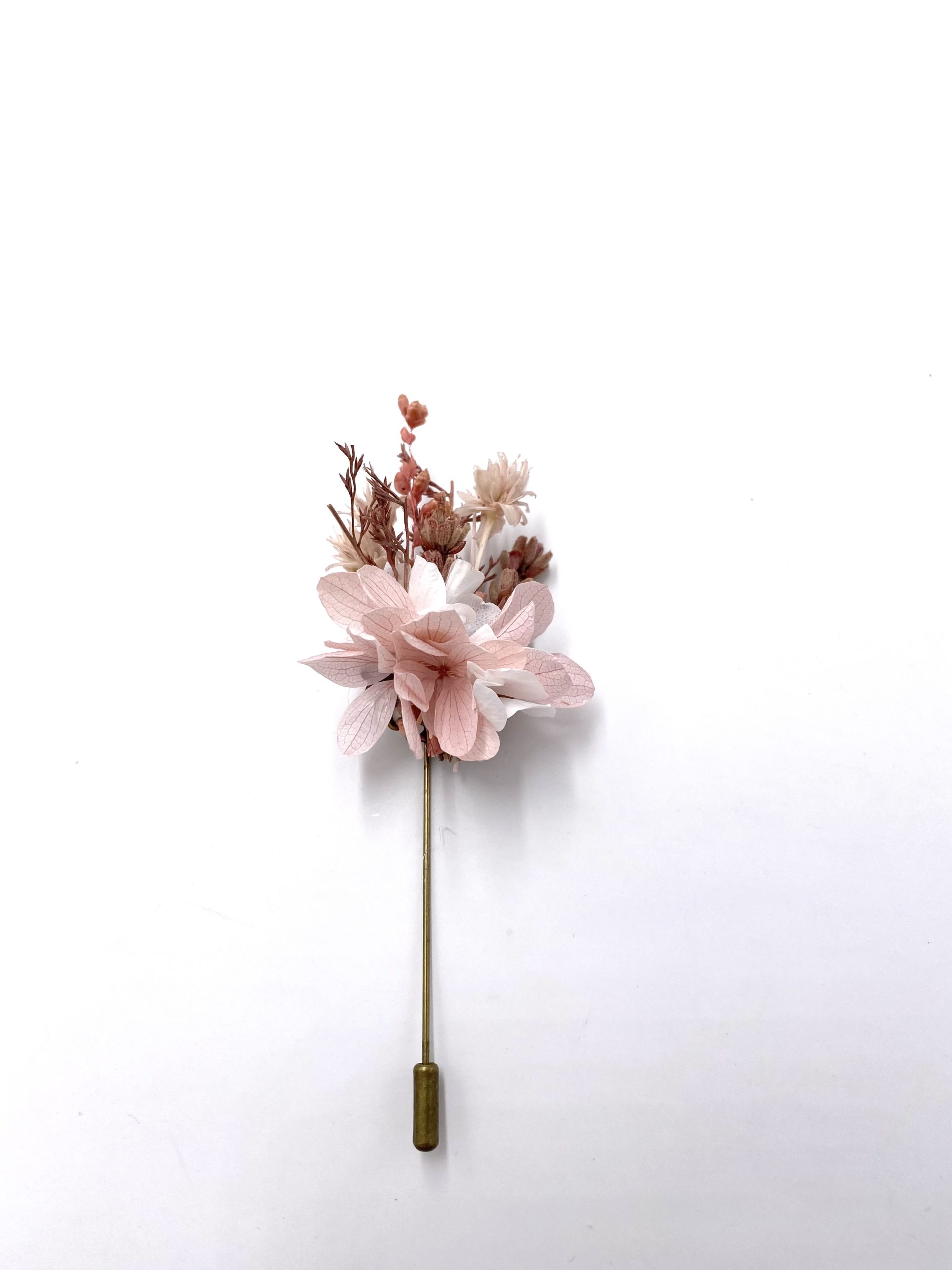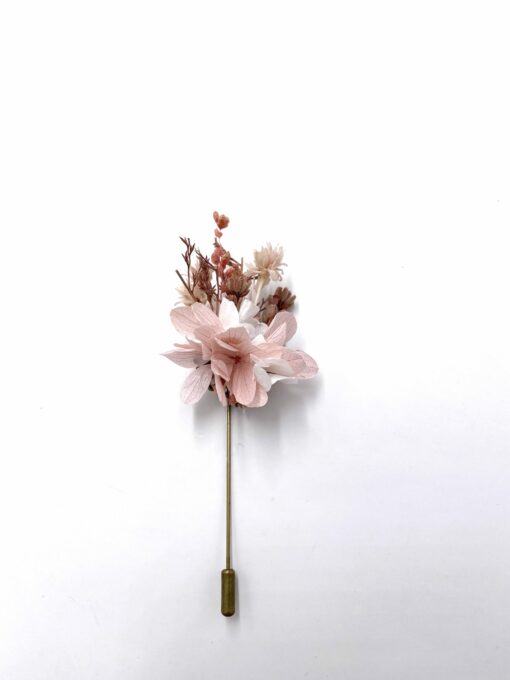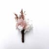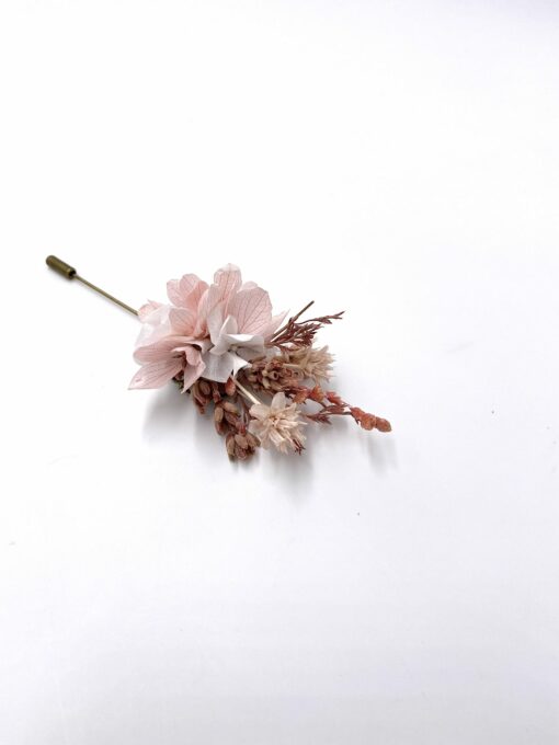 La boutonnière broche Chérie est composée d’un mélange de fleurs stabilisées et séchées : hortensias (vieux-rose, blanc), mini-gypsophile, marcella, herbe sauvage, billes de lin…