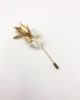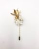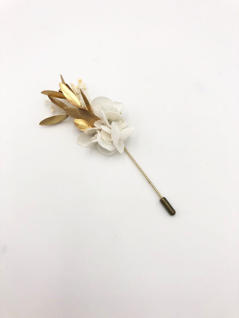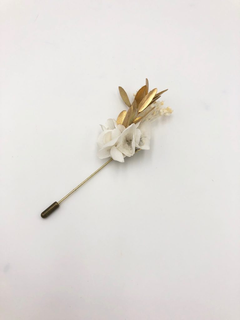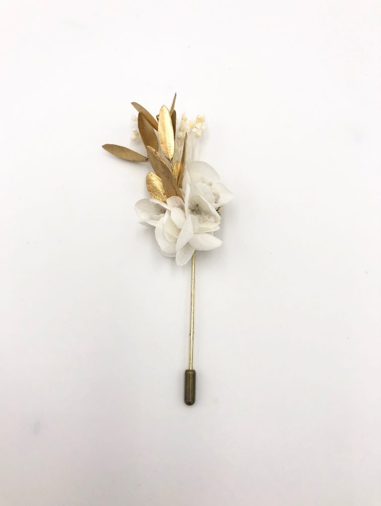 La boutonnière en fleurs Ori est une alternative à la boutonnière Ori classique, dans esprit antique très élégant. Ce mélange sophistiqué et chic de fleurs stabilisées et de fleurs séchées donne un résultat particulièrement réussi, dans l’esprit antique de la collection Orichalque. Mêlant les tendances du doré avec celles de tonalités blanches, la boutonnière en fleurs Ori est un petit bijoux à la fois masculin et délicat, avec son pic à chapeau des plus élégants.