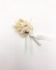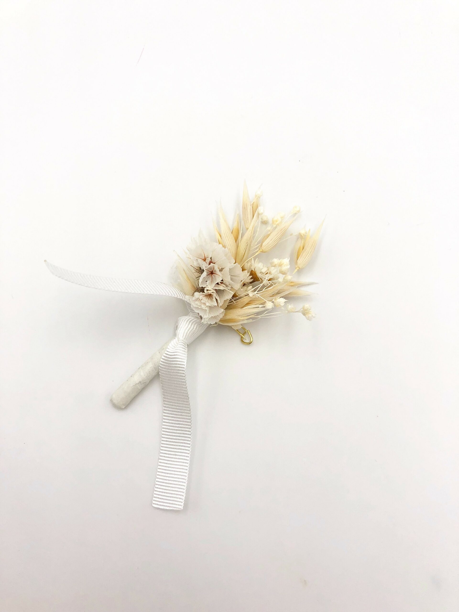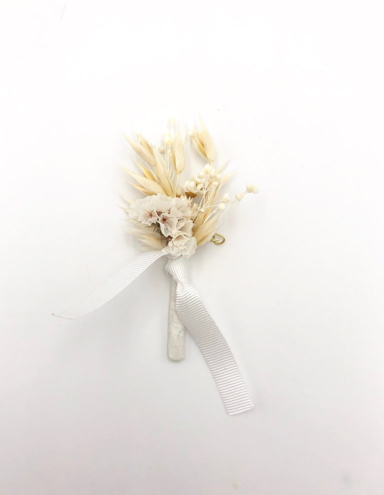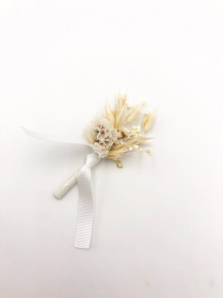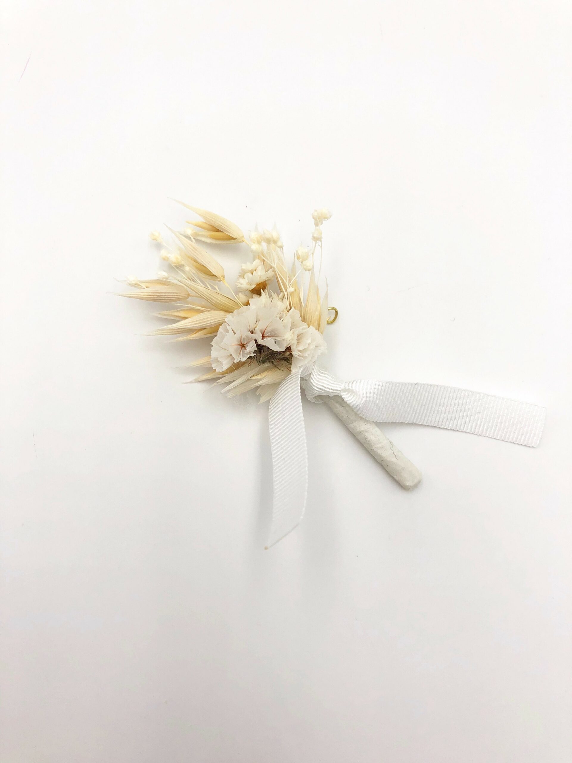 La boutonnière en fleurs séchées Auguste fait partie de la collection Folk, qui se caractérise par ses tons doux dorés, blonds et crème. Chic et champêtre, la boutonnière de marié Auguste est un mélange délicat de fleurs séchées et se conservera durant plusieurs années. Elle associe ainsi des brins d’avoine séché et blanchi à de délicates têtes d’acroclinium blanc, avec quelques brins de broom finement déposés. La gamme Auguste représente parfaitement l’esprit de fleurs des champs dorées par le soleil d’été, donnant un look à la fois sobre, chic et résolument folk.