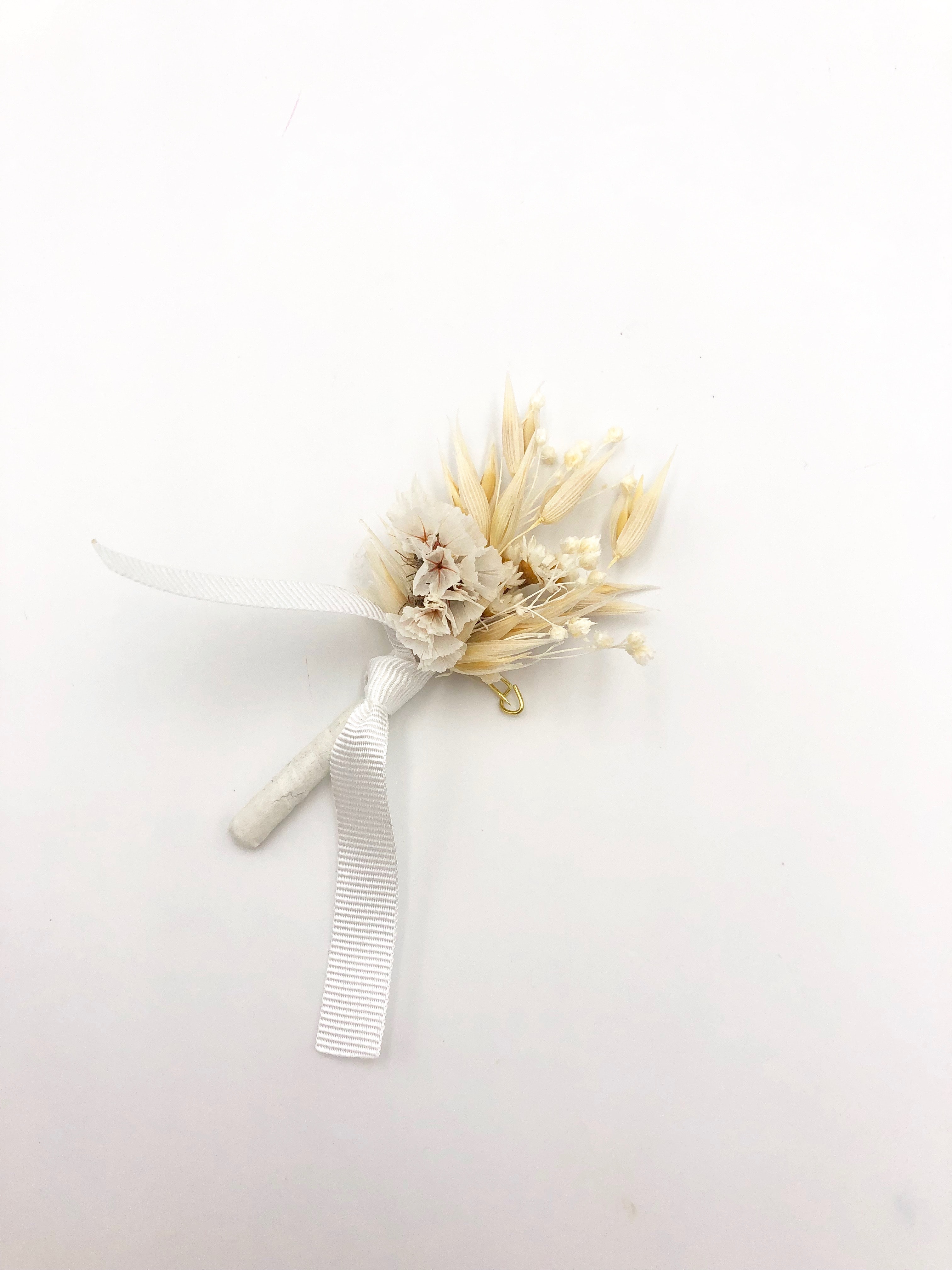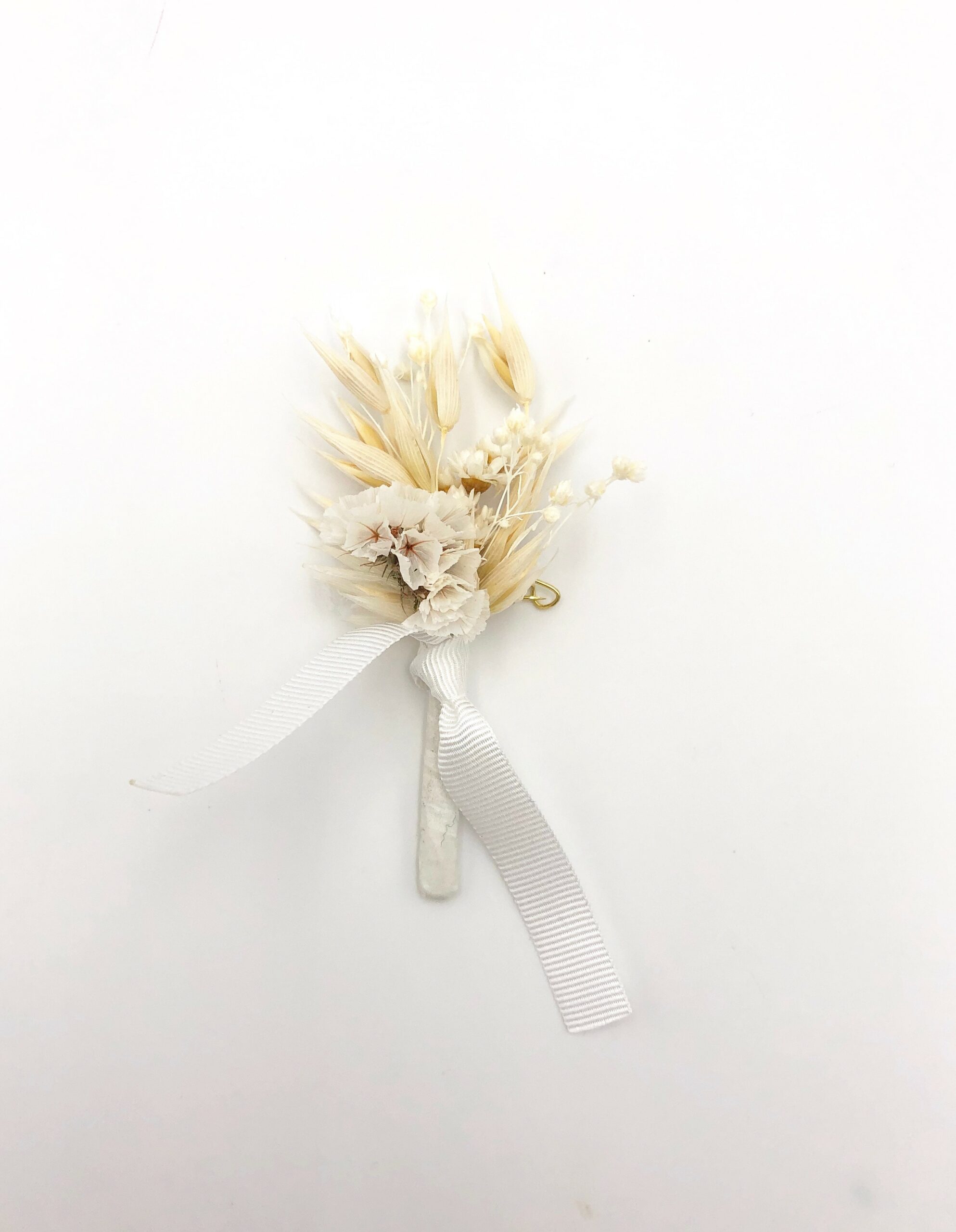 La boutonnière en fleurs séchées Auguste peut s’associer avec différents accessoires pour les demoiselles d’honneur, comme la barrette Auguste ou encore ses bracelets simples et élégants. Il est recommandé que le futur marié arbore cette boutonnière, en même temps que la future mariée porte la couronne Auguste, effet garanti !