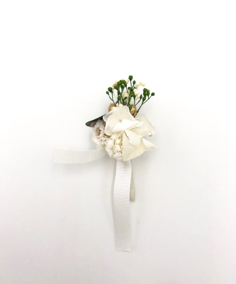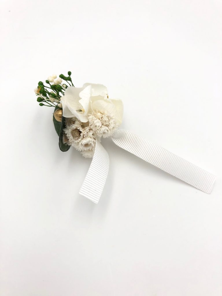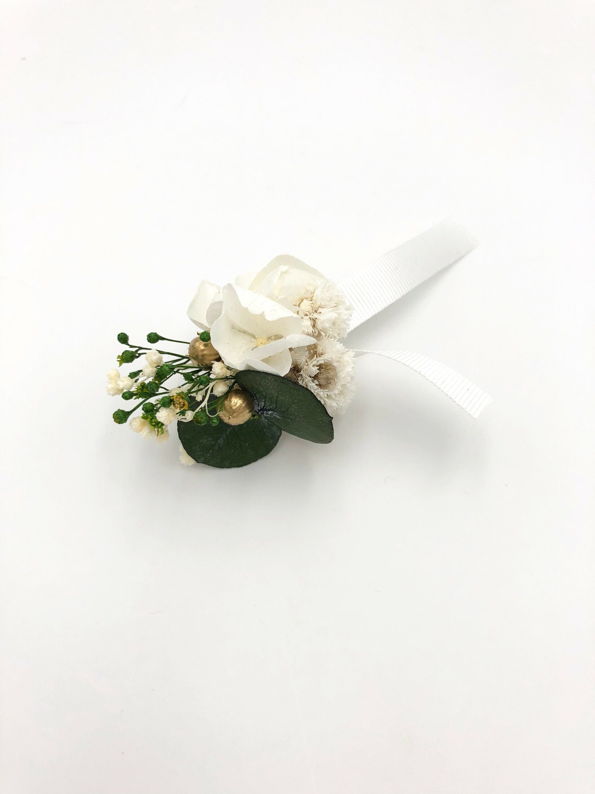 La boutonnière en fleurs séchées Minthé fait partie de la gamme Minthé et de la collection Végétale pour la saison 2019. C’est un accessoire qui se veut très frais et élégant, combinant le vert doux de l’eucalyptus baby blue avec l’ivoire des immortelles séchées, le blanc immaculé de petits pétales d’hortensia stabilisée et l’éclat de quelques billes de lin séché doré. Cet accessoire de mariage est une boutonnière en fleurs séchées (immortelles, lin doré) et en fleurs stabilisées (eucalyptus, hortensia, gypsophile).