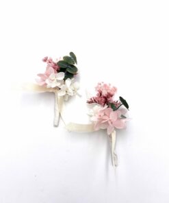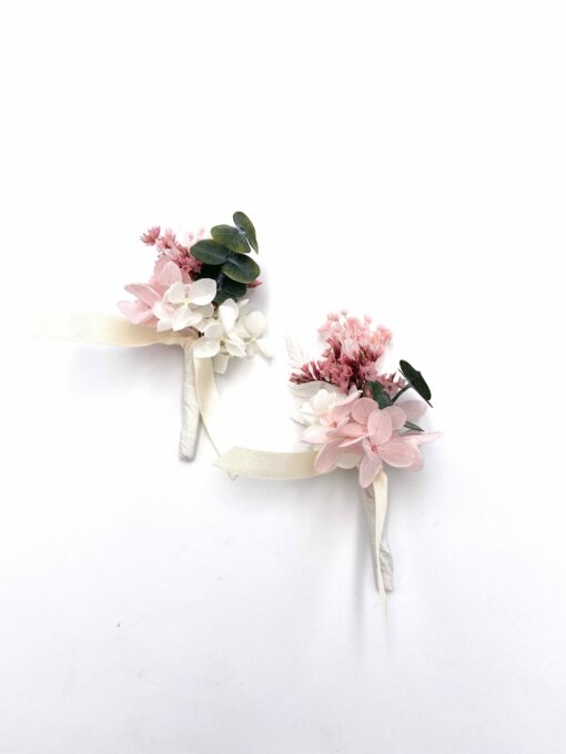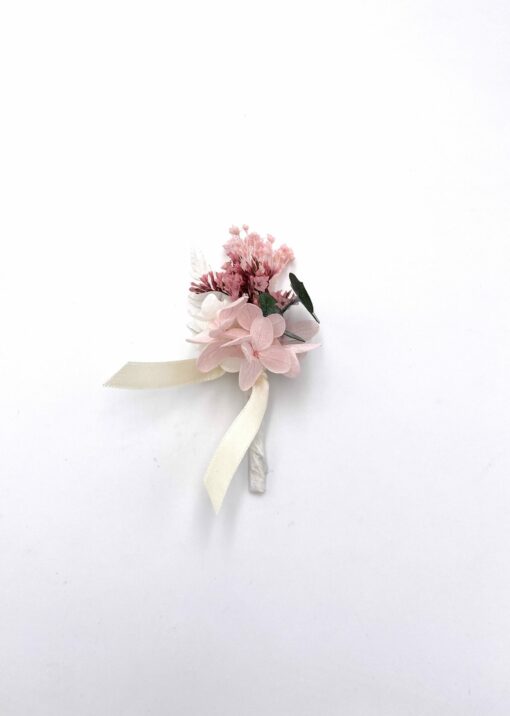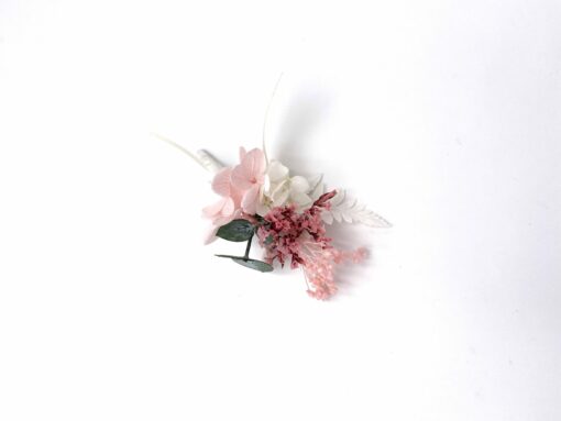 La boutonnière du marié Tourmaline se compose ainsi de plusieurs fleurs stabilisées : hortensia mini blanc, rose pâle et rose café, eucalyptus baby-blue et limonium vieux-rose. C’est un accessoire très frais et romantique, qui sera parfait pour associer le marié à la mariée ainsi qu’au cortège.