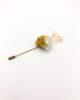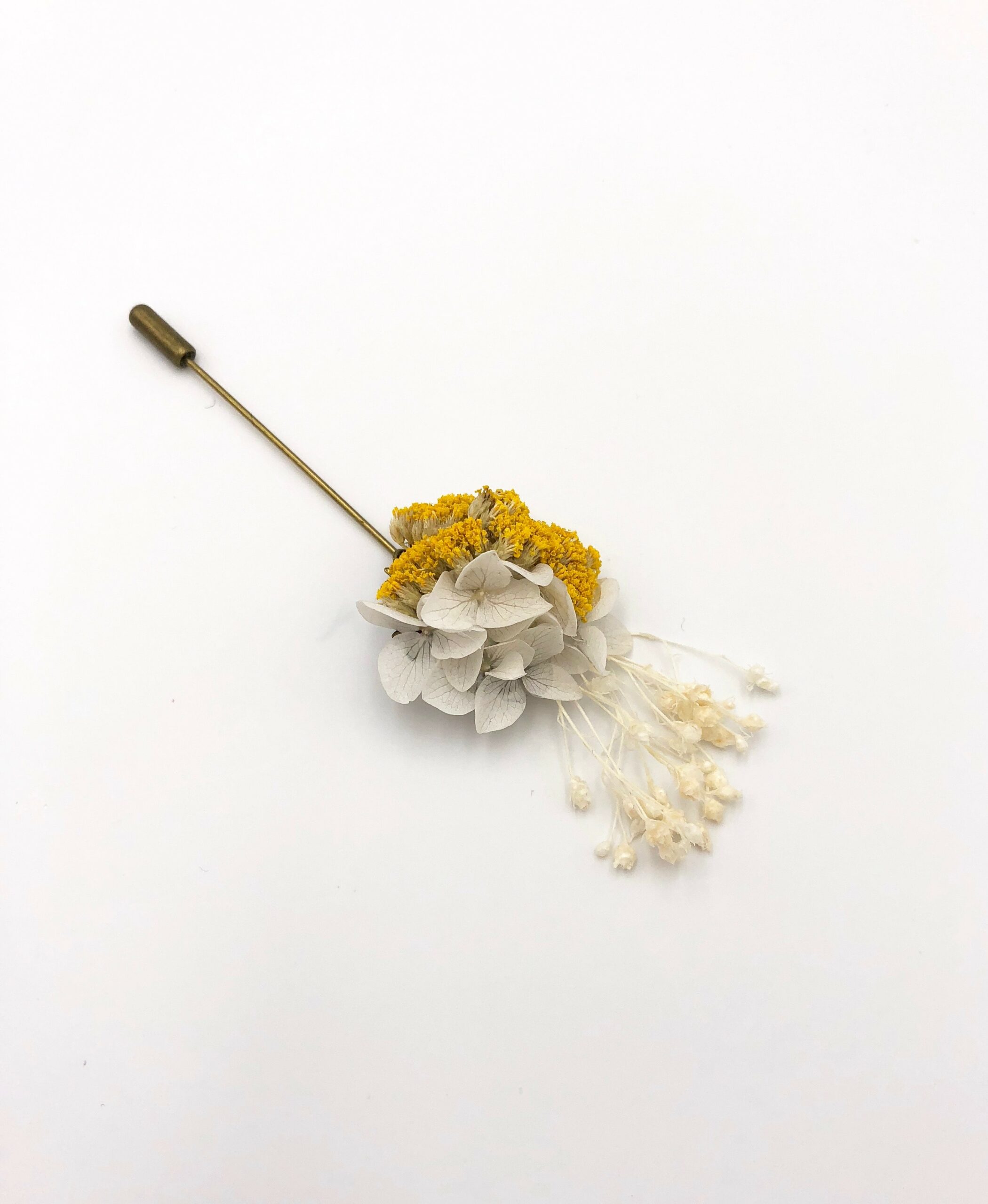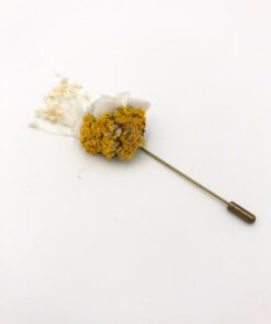 Conçu en fleurs stabilisées et séchées, cet accessoire se conservera des années. Avec ses tons moutarde et blanc, la boutonnière de mariage Hysope est masculine et tendance.