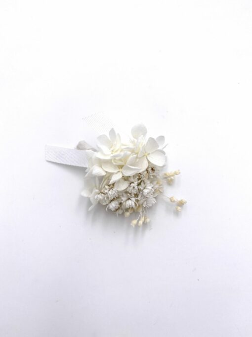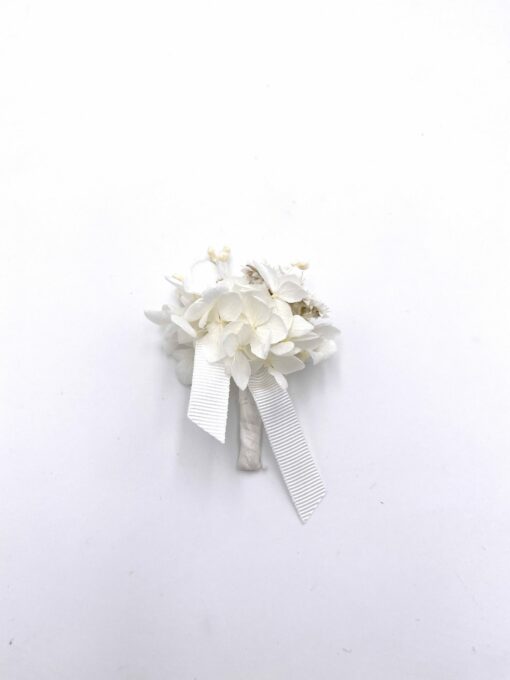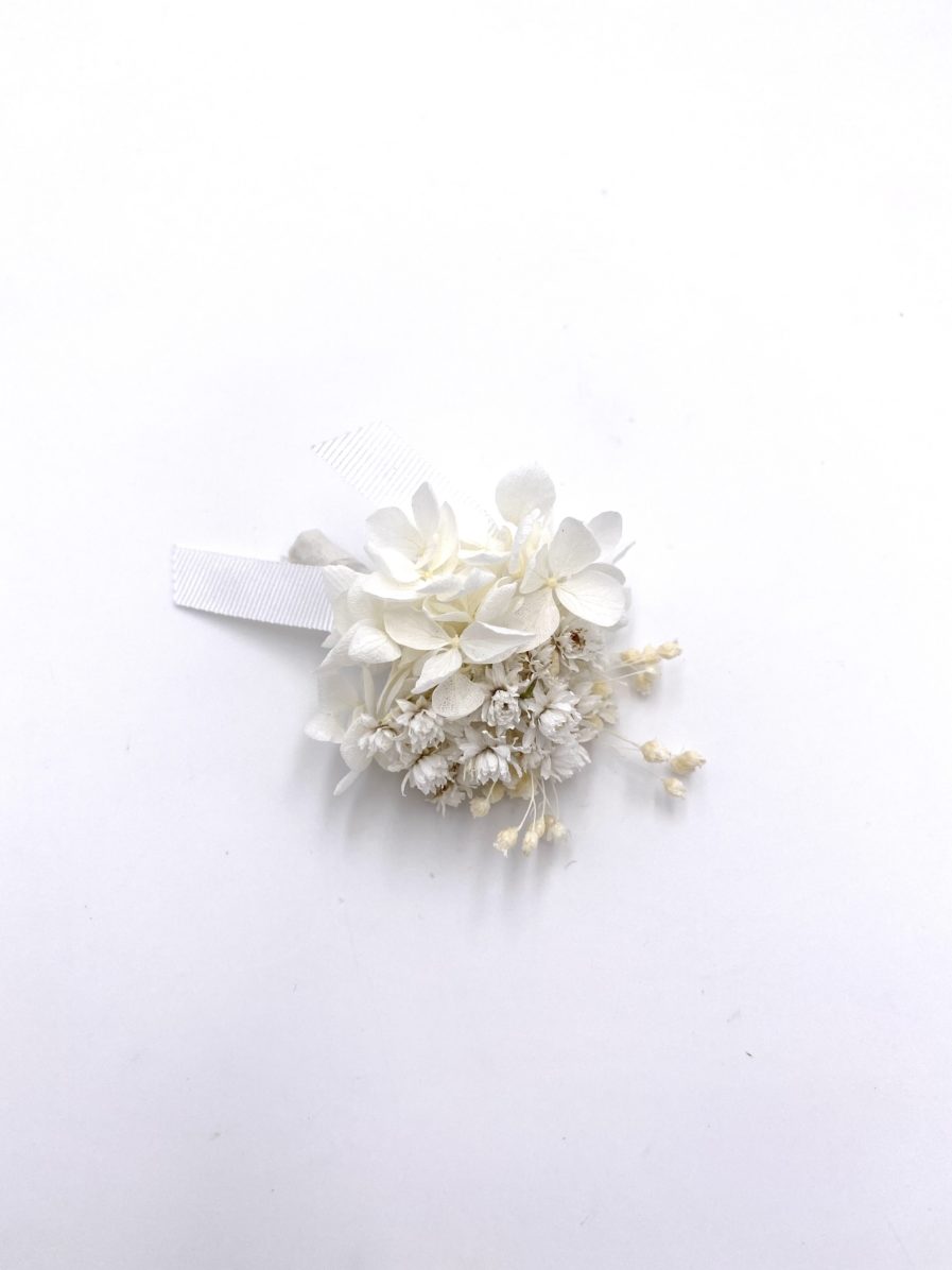 La boutonnière de mariage Immortelle évoque la douceur et la force d’un amour pur avec ses généreuses fleurs d’Immortelles blanches. Son design entremêle avec raffinement la rondeur des fleurs d’Immortelles et les délicates fleurs d’Hortensia blanches. Elle se décline dans les tons blancs et ivoire. Immortelle est une véritable ode à l’amour.