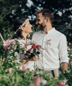 La boutonnière en fleurs stabilisées Jardin fait partie de la gamme Jardin, qui rassemble des accessoires pour la mariée déclinés autour des tonalités romantiques et naturelles du rose et du vert naturel, vert pâle. C’est un retour à la nature, matérialisé par ce shooting d’inspiration lifestyle dans une roseraie unique dans le Var.