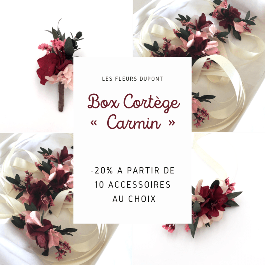 La Box Cortège Carmin en fleurs stabilisées est proposée par Les Fleurs Dupont à partir de la saison 2021, pour faciliter le choix des accessoires du cortège de mariage. Déclinée sur les tons bordeaux, rouge et végétal, la box permet de choisir entre les bracelets de demoiselles d’honneur et les boutonnières Carmin pour les témoins ou le marié.